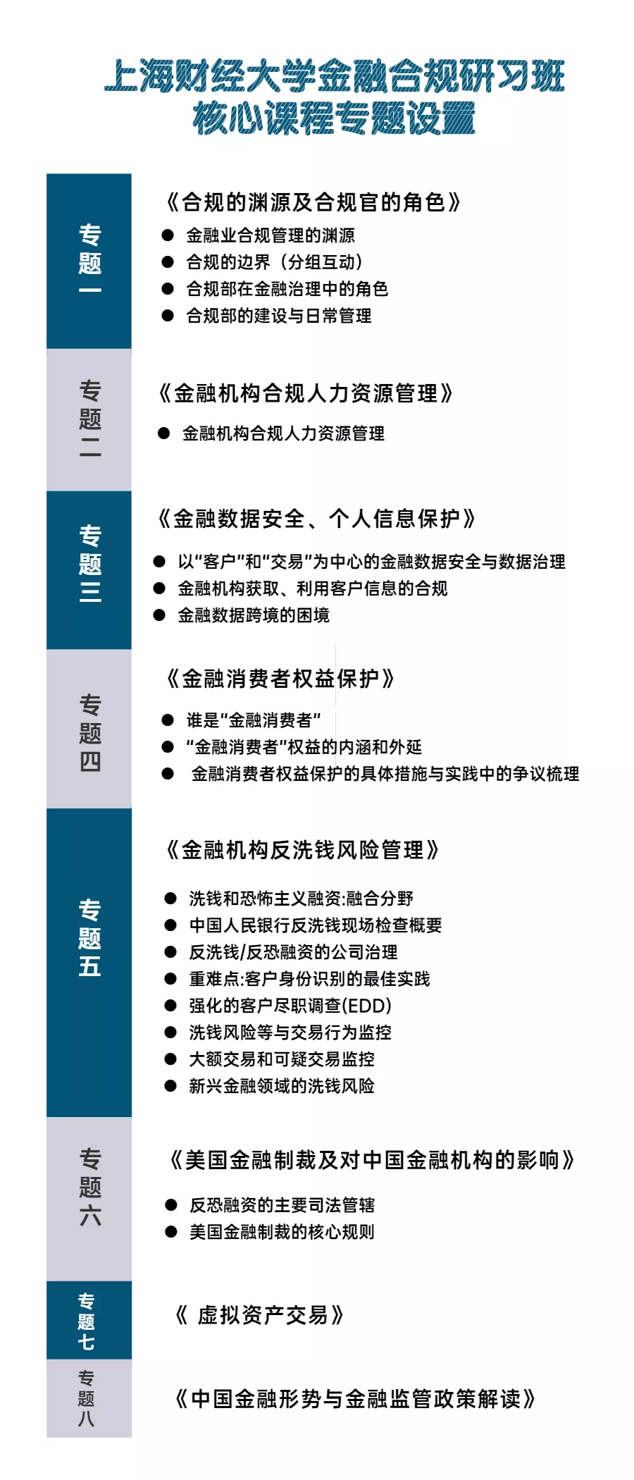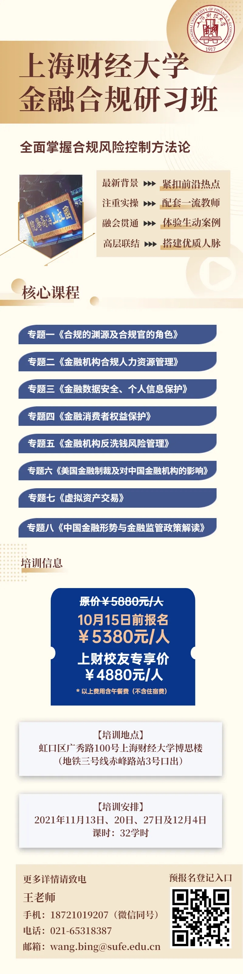 为推动金融机构合理评估合规成本与收益、全面提升合规风险管理能力,上海财经大学继续教育学院特举办此次培训班。我们将特邀金融合规领域的5名资深专家进行知识分享及深入交流探讨,紧扣当前金融合规领域的热点、难点问题,并结合热点案例进行深度分析,帮助金融机构高管、合规、法务及律师提高金融合规风险管理的实务能力。