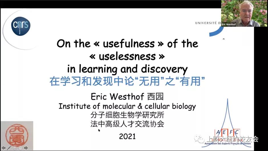 法国科学院RNA领域资深院士 Eric Westhof博士 在Herschbach博士的精彩演讲之后,南京大学法国校友会张翼会长欢迎法国科学院院士。 Westhof博士的演讲主题为“在学习和发现中论无用和有用”。Westhof博士首先向大家推荐了一本书 “The Usefulness of Useless”。院士通过RNA和分子进化过程为大家讲述了自然科学中的无心插柳柳成荫。院士认为科研应该由好奇心来驱动,而不是是否有用来驱动。当下看上去没有用的东西,在未来、在不同的环境和条件下可能就会变得非常“有用“。院士接着举了更多的例子,说明一些看似无用的研究是如何改变我们现在的生活。比如质数理论之于信用卡的应用,爱因斯坦相对论之于全球定位系统的应用等等。院士强调,大家需要“be prepared to be surprised”, 这需要平时学习的积累以及对所学知识的认知。只有这样,才能在正确的时间、正确的节点,通过正确的观察获得突破性的发现。最后,院士用CRISPR技术40年发展的例子再次阐述了“Useless”是如何转变为 “Usefulness”的。