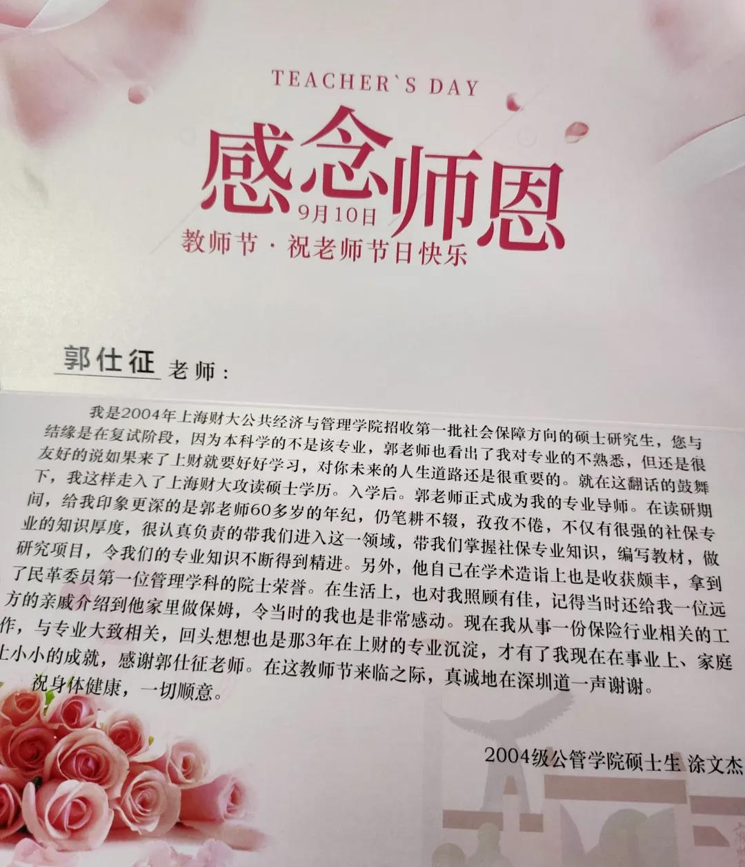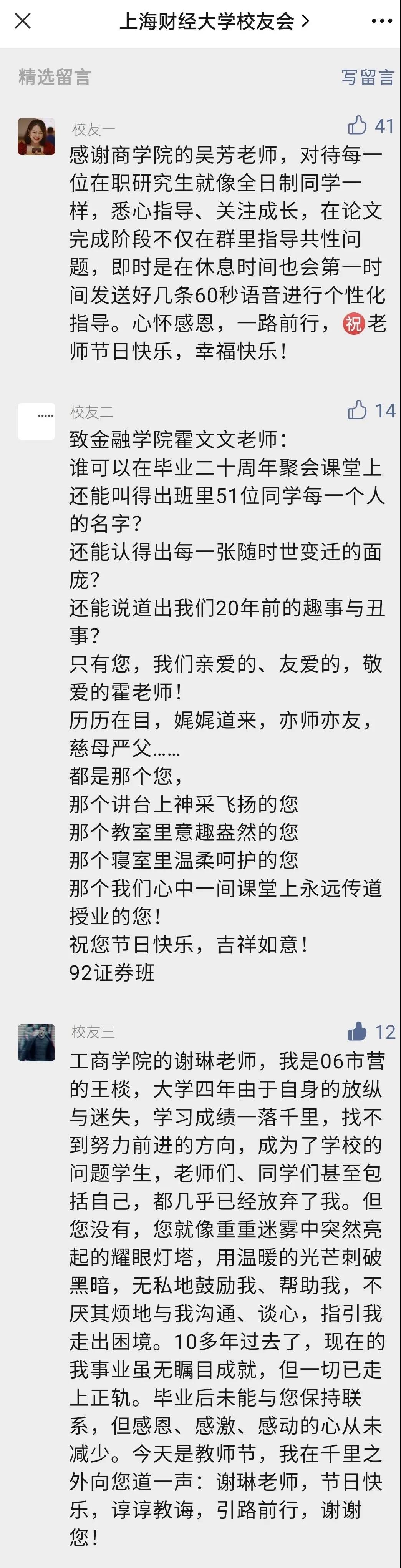 此外,金融学院霍文文老师、上财国际金融中心研究院赵晓菊老师、公共经济与管理学院郭仕征老师也都收到了来自校友们的祝福和校友总会寄送的问候。