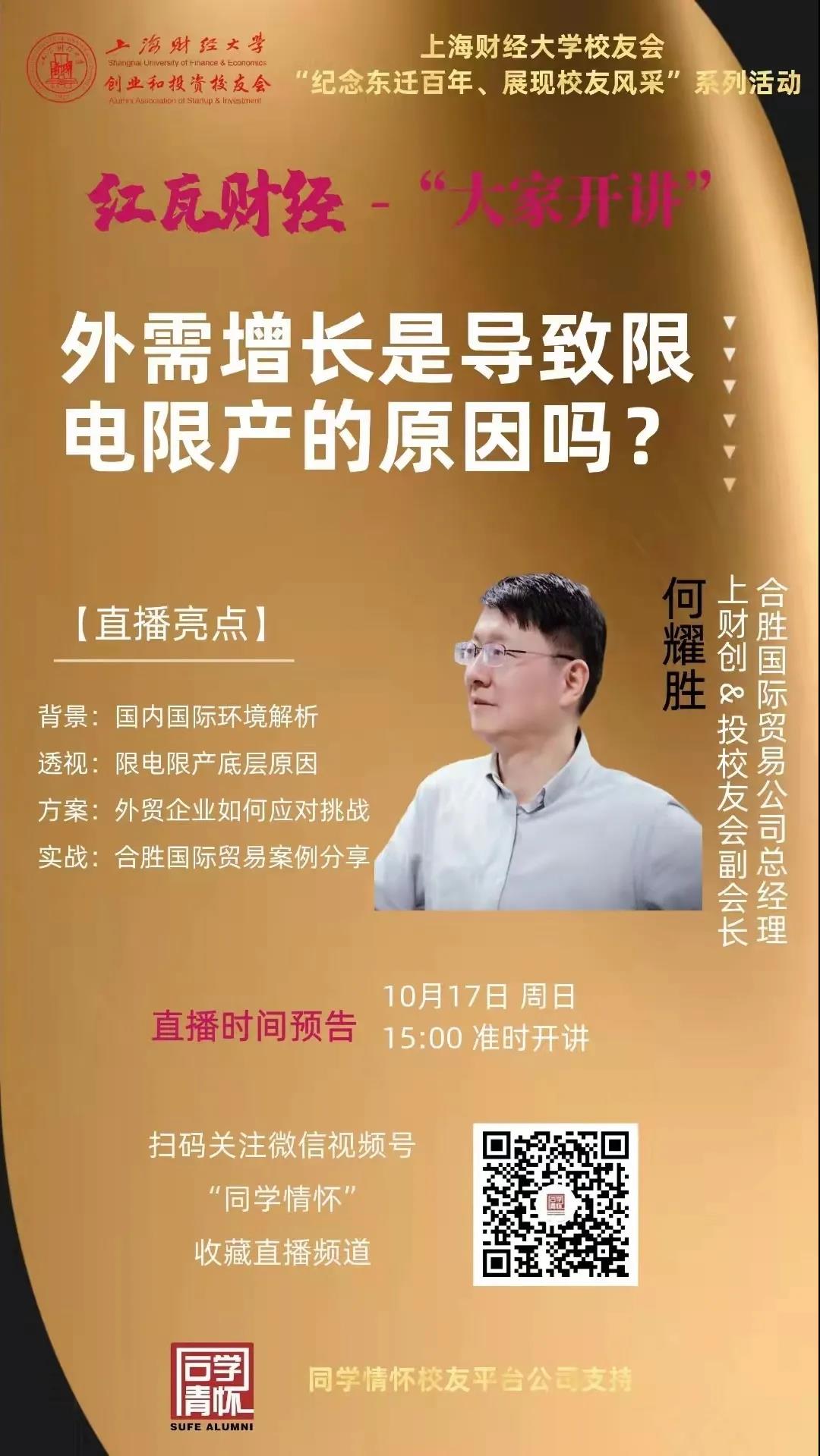 红瓦财经 节目回顾 首期“大家开讲”已于10月17日下午3点顺利直播在线开讲。上财创&投校友会副会长、合胜国际贸易有限公司总经理何耀胜校友作为栏目开播的首场嘉宾,就热门话题“外需增长是导致限电限产的原因吗?”进行了专业视角的解析和实践分享。