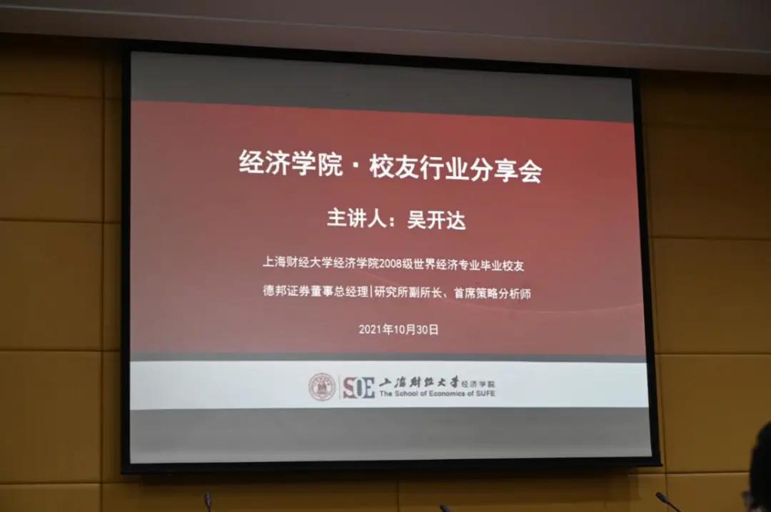 10月30日上午10时,由上海财经大学经济学院校友会和经济学院学生会联合主办的校友行业分享会在经济学院楼511室顺利举办。本次讲座邀请上海财经大学经济学院2008级世界经济专业毕业校友、现任德邦证券董事总经理、研究所副所长、总量组长、首席策略分析师吴开达校友作为主讲人,为我院师生带来题为“证券策略研究思想、框架和应用”的精彩演讲。学院校友代表、部分老师以及逾五十名学生到场聆听。活动由经济学院院长助理、校友工作负责人黄振兴常任教授主持。