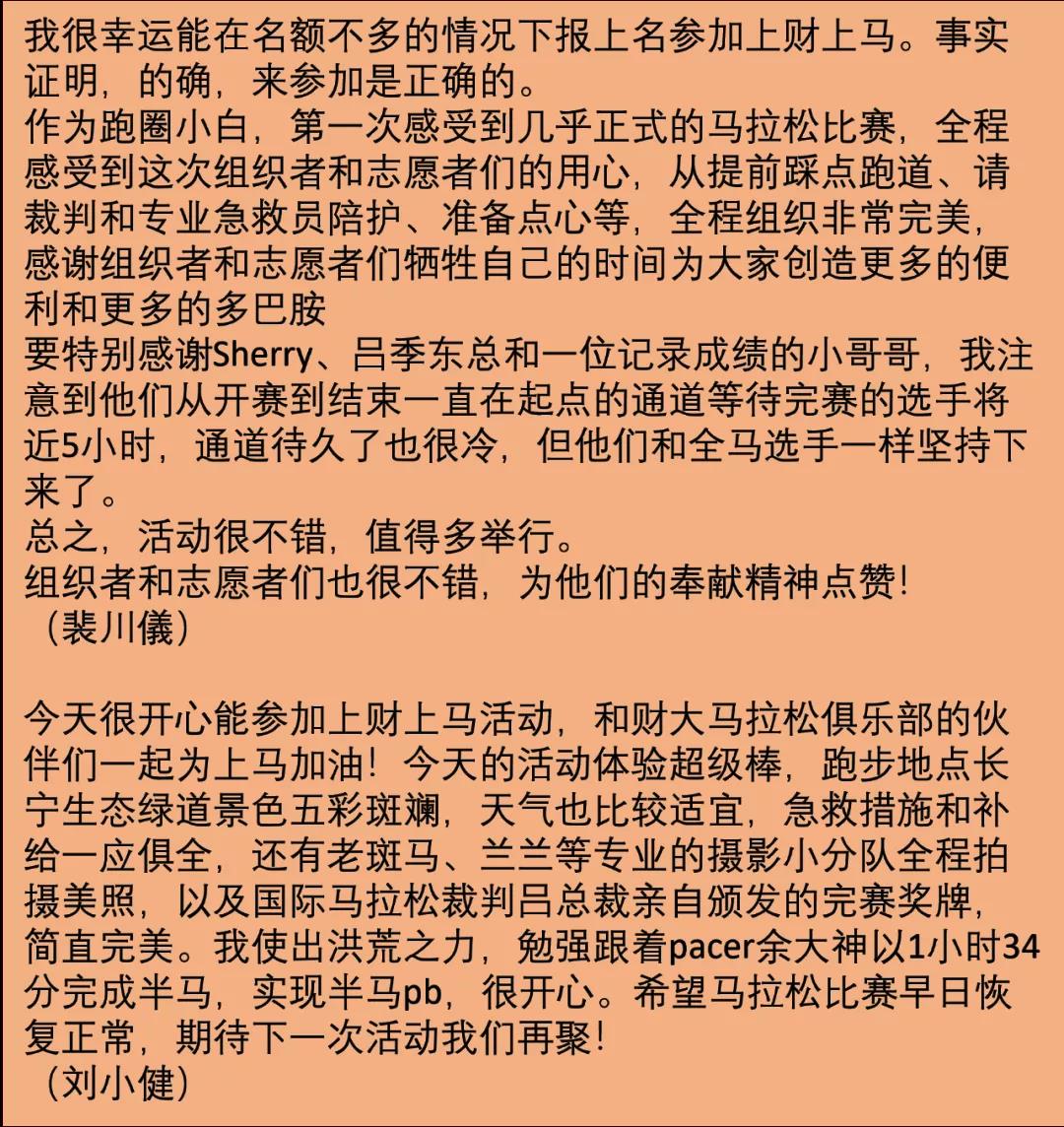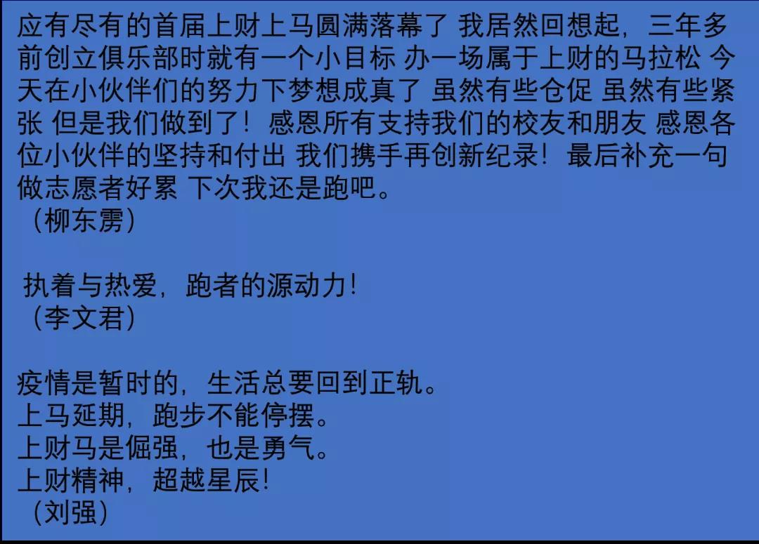 *************************************** 以下是参加首届“上财上马”活动校友们的心声感言: