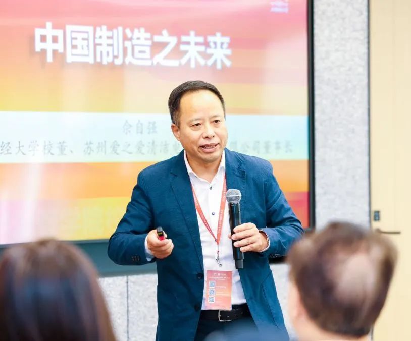 上海财经大学校董、苏州爱之爱清洁电器科技有限公司董事长佘自强校友聚焦“制造”二字发表演讲。他深度分析日本尖端制造业和美国创新之路,并以苹果、谷歌和微软等知名公司为例,分析其商业模式与人才培养特点,对中国制造业未来发展方向提出独到见解。他强调中国制造业需要通过技术创新和产业升级,沉下心来去实现从中华制造到中华创造再到中华智造的转变。