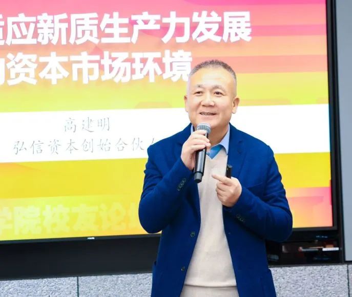 弘信资本创始合伙人高建明校友在主题演讲《创造适应新质生产力发展的资本市场环境》中,分享对当前资本市场看法。他认为,满足外企和政府投资需求的经济发展模式已无法适应新的发展环境。未来,中国经济增长将以进口替代和创造需求的新质生产力为主。资本市场能支持创新,但还无法满足新质生产力的发展需要。IPO审核理念侧重业绩规模和规范而非充分信息披露,就难以催生更多具有科技创新活力的企业。高建明校友呼吁,改革现有资本市场制度以适应新质生产力的发展需要。