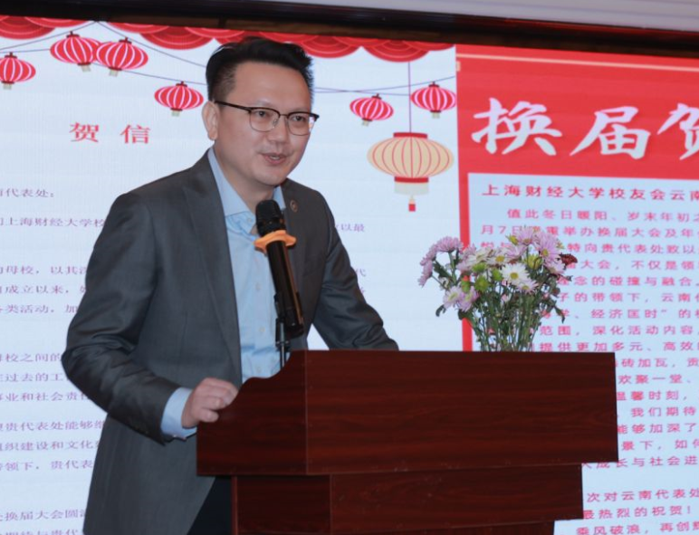 广西代表处张荣晖会长代表兄弟校友会致辞,对新当选的理事会成员表示祝贺;强调广西和云南山水相连情谊相通,希望加强之间的交流,共同建设好上海财经大学校友服务平台。