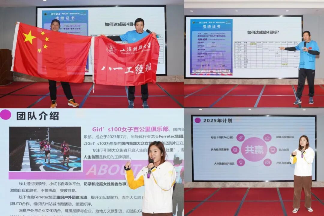 上财校友会浙江代表处陈建红秘书长分享了《全马破4》的过程,激情洋溢地介绍了他从2019年跑马至今,如何一步步突破,于今年11月24日衢马达成破4目标,跑出健康,跑出快乐,让人感受到了运动的魅力与力量。黄佳俊校友一并介绍了成立于2023年7月、专注于引领大众跑者开启人生第一个“1公里”的“Girl’s100女子百公里俱乐部”,对俱乐部的发展、未来布局做了展望,已然跑出视野,跑出事业!