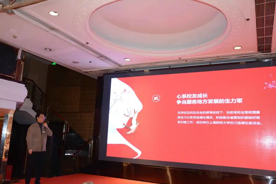 在岁末欢聚的这天,我们感恩所有的相遇与再见,庆祝一年的成就与收获,在交流与分享中进一步凝聚所有上财人的心。每位校友都是一片叶,共同构建成代表处这棵葳蕤挺拔的参天大树。四川代表处早在去年11月就开始筹划本次年会活动,会务组倾注心血、亲历亲为,从组织接洽、流程策划、活动安排,到场地选择、会场布置、节礼准备等环节全覆盖,每处细节皆系精心打磨。