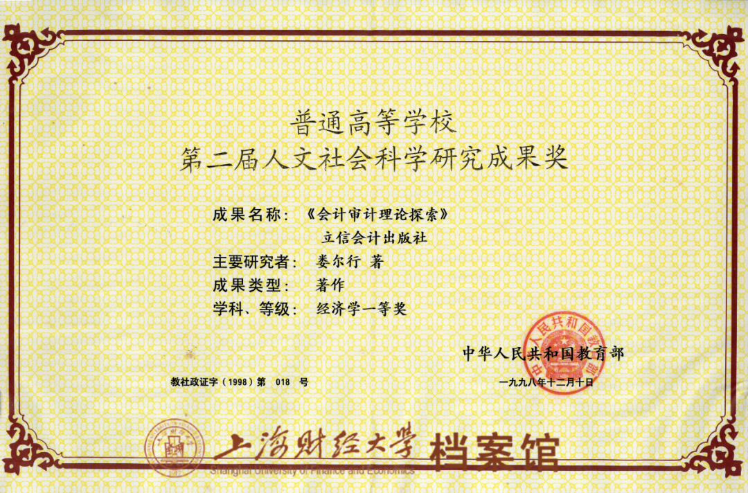 1998年,娄尔行《会计审计理论探索》获第二届人文社会科学研究成果奖经济学一等奖证书(娄有世捐赠,2024年)