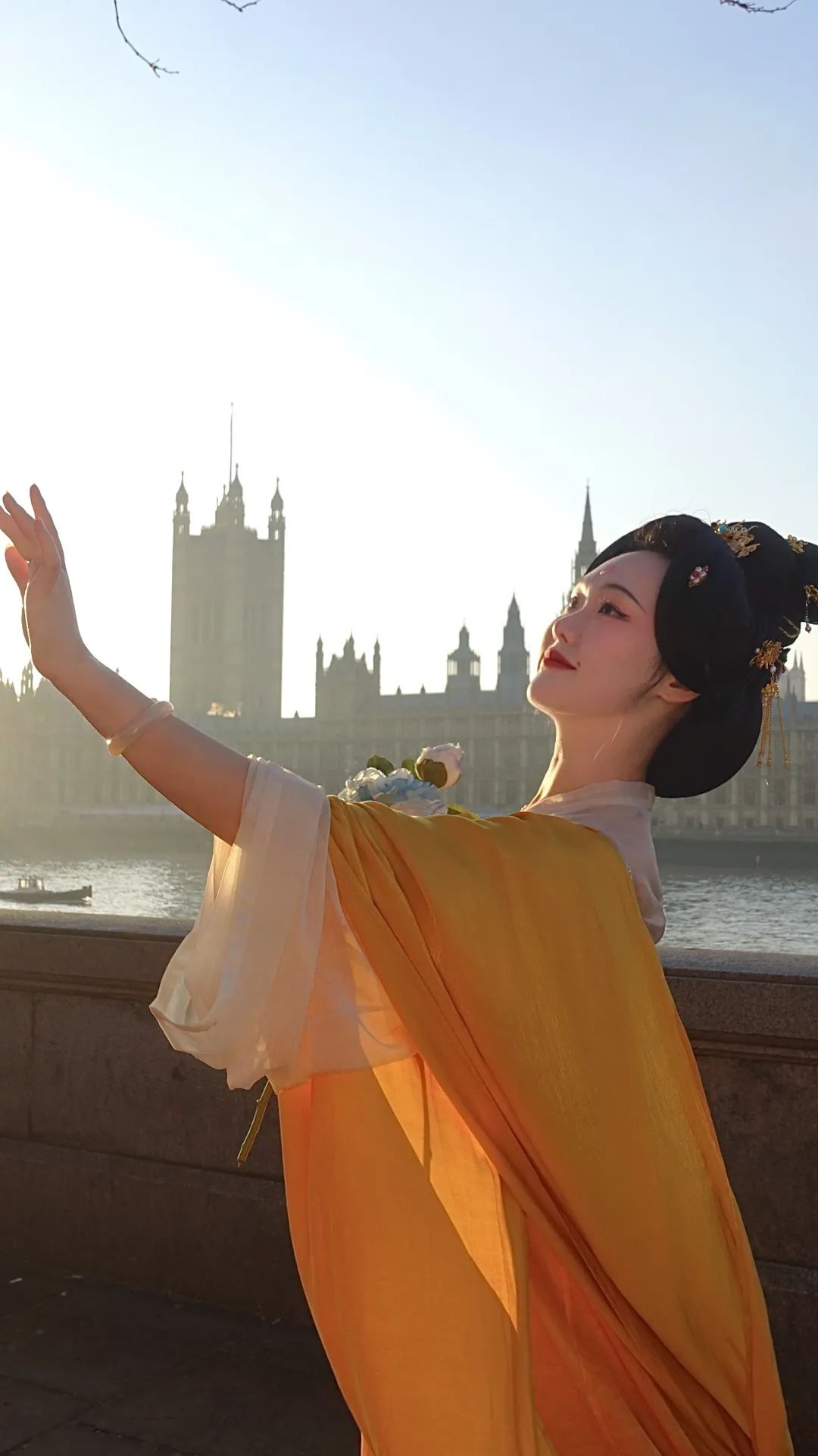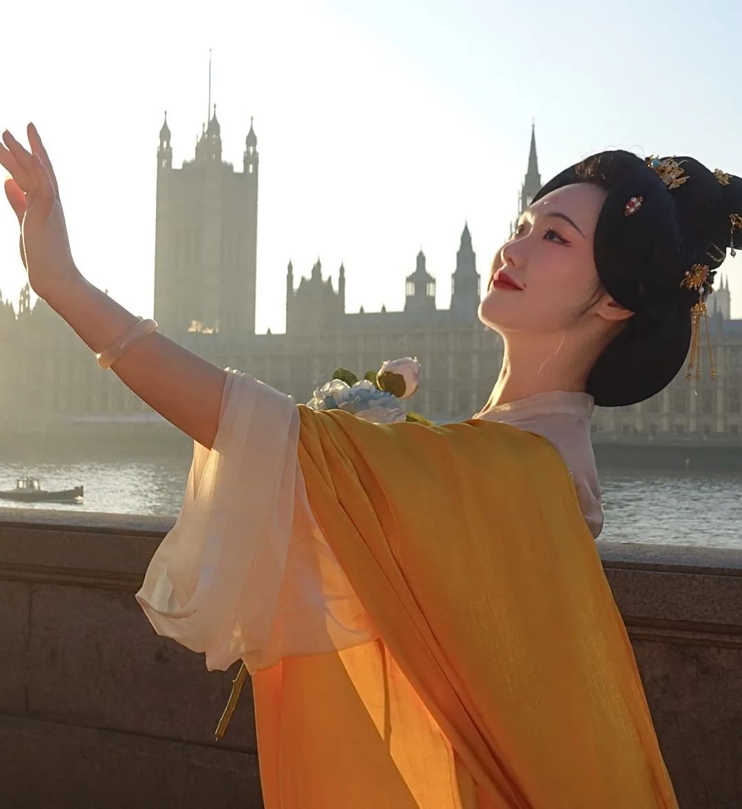 我是造型展示组的组织者、并作为团队妆造组的主要负责人。在大学期间,我就参与过多次类似的活动,所以在拍摄中,我本人也是作为造型展示组出镜的同学,所以成片更多的画面会是唐朝服饰和妆容、与英国伦敦大本钟 伦敦眼的一个中西文化碰撞。