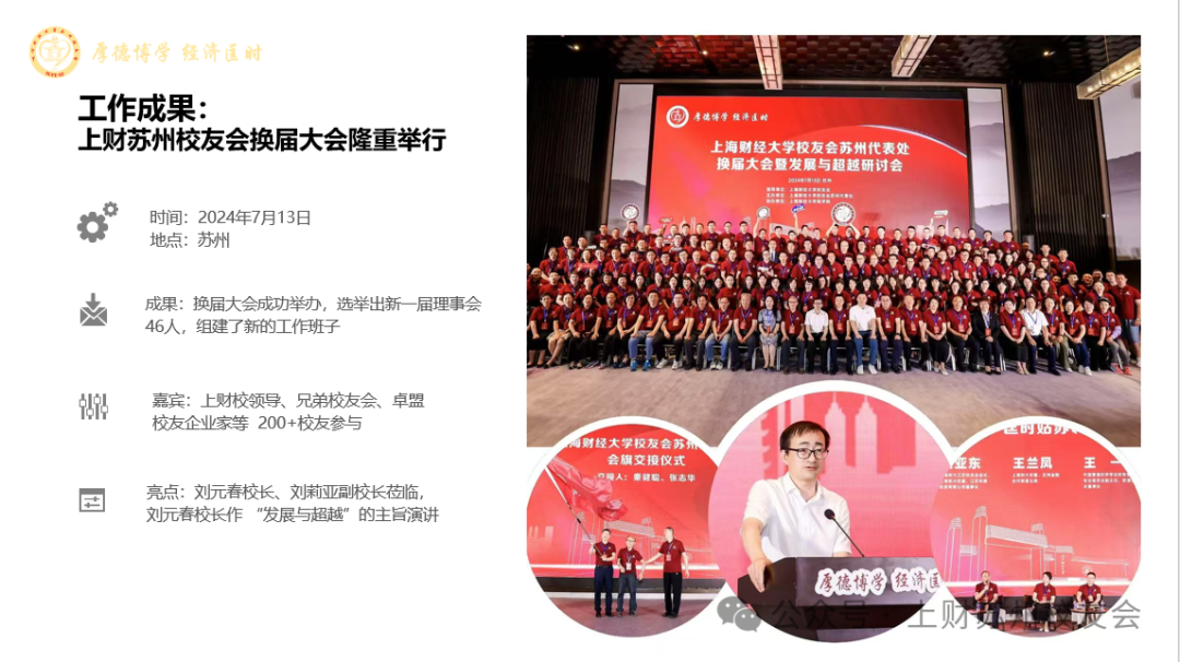 ✔ 2024年7月顺利完成换届工作,在会长领导下,新的工作班子注入了活力。半年来苏州校友会积极开展校友工作,赢得了赞誉。