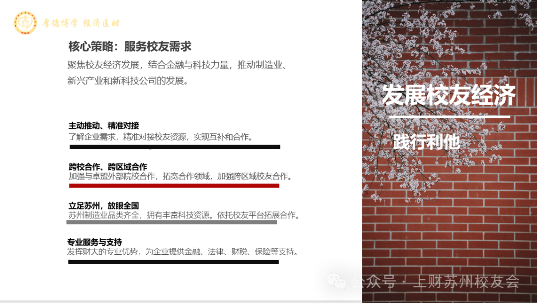 ✔苏财汇研学:全年开展20+企业走访,强调校友网络、校友经济、校企合作与品牌推广的重要性。
