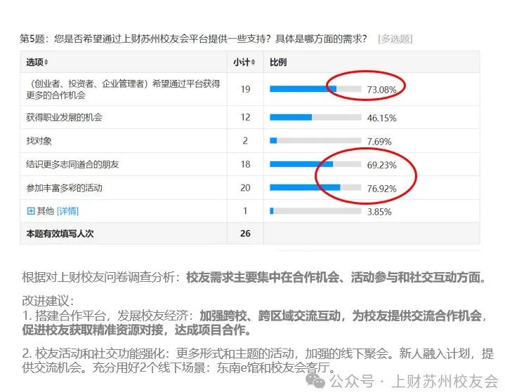 ✔建立常态化校友需求反馈机制,积极回应校友需求。校友需求主要集中在合作机会、活动参与和社交互动方面。73%的校友期望通过校友会平台获取更多合作机遇。