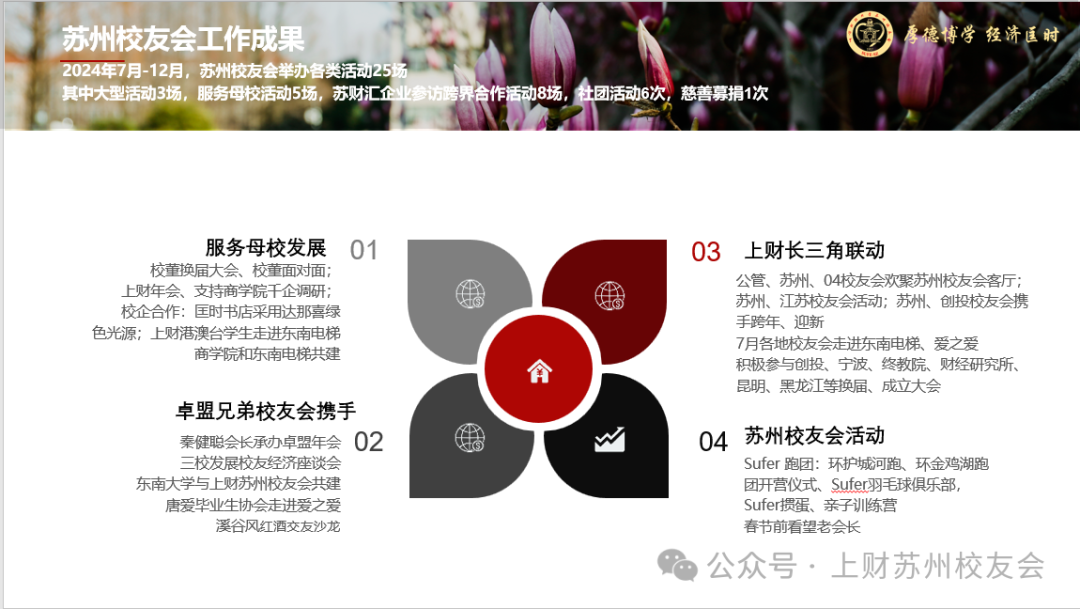 ✔2024年7月-2025年1月,苏州校友会举办各类活动25场,其中大型活动3场,服务母校活动5场,苏财汇企业参访、跨界合作活动8场,社团活动6次,参加慈善募捐1次。参与4场母校举办的活动。