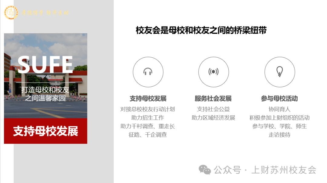 校友会不以盈利为目标,但校友们须思考如何更有效地发挥平台的作用与价值。我们已着手探索校友经济的发展路径,举办了诸如东南大学参访、电子科大、华东政法及上财三个苏州校友座谈会等活动,并与上财河南、四川校友会、东大四川校友会等建立了联系,旨在推动校友经济的发展。目前,大家在发展校友经济理念上已达成共识,但在方法上仍需探索实践。校友间的信任基础与信息流通,无疑将提升获客概率并降低获客成本,也将为母校的发展做出更多贡献。
