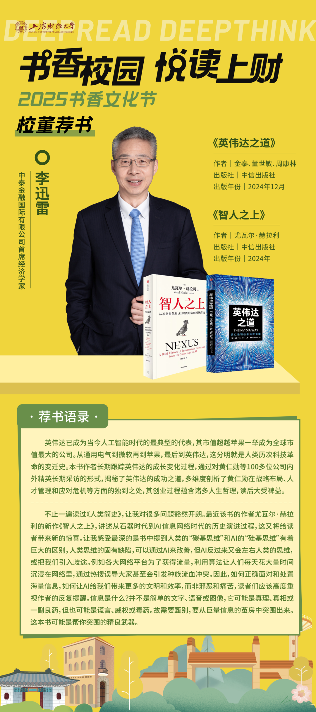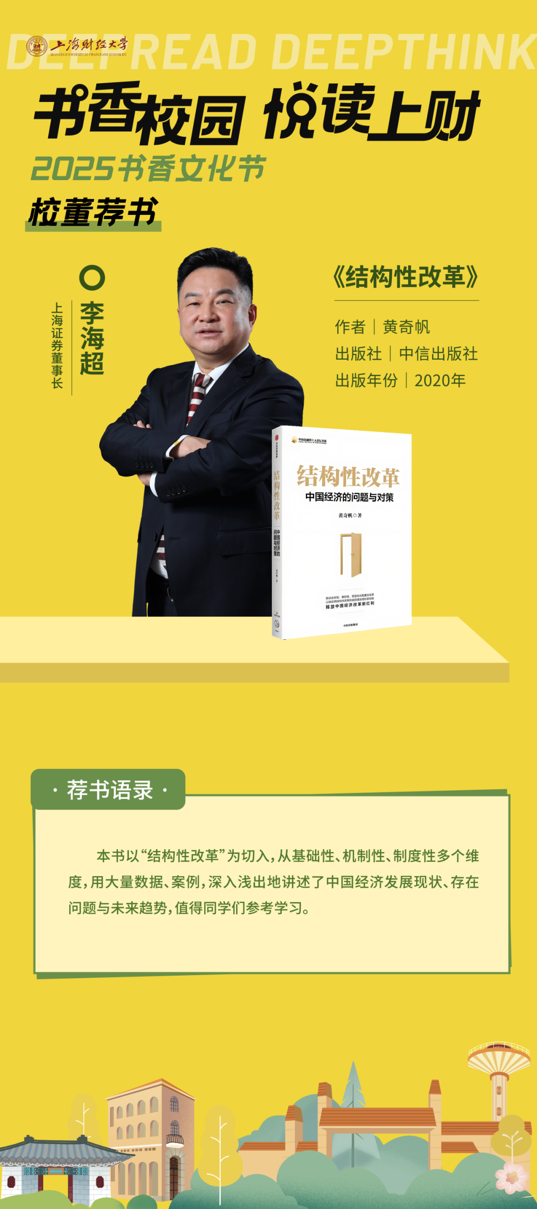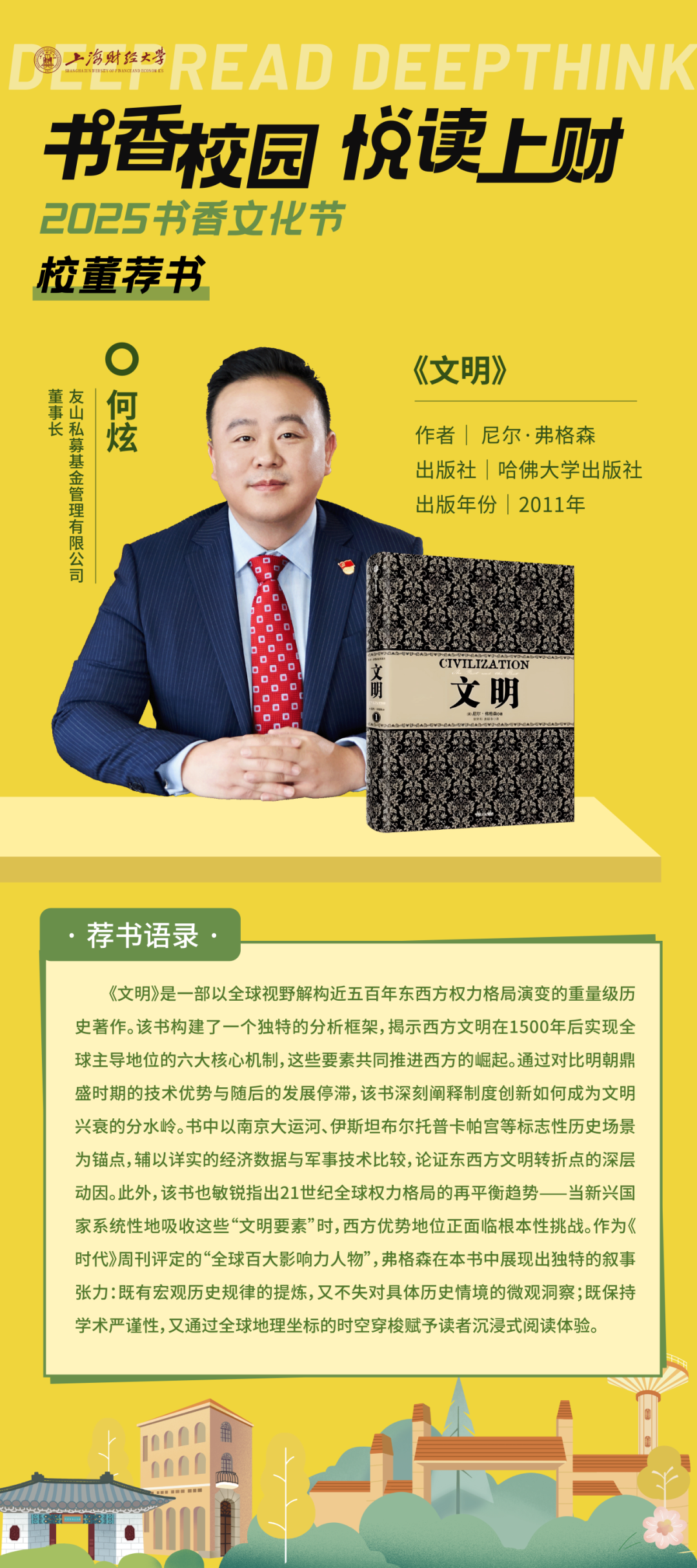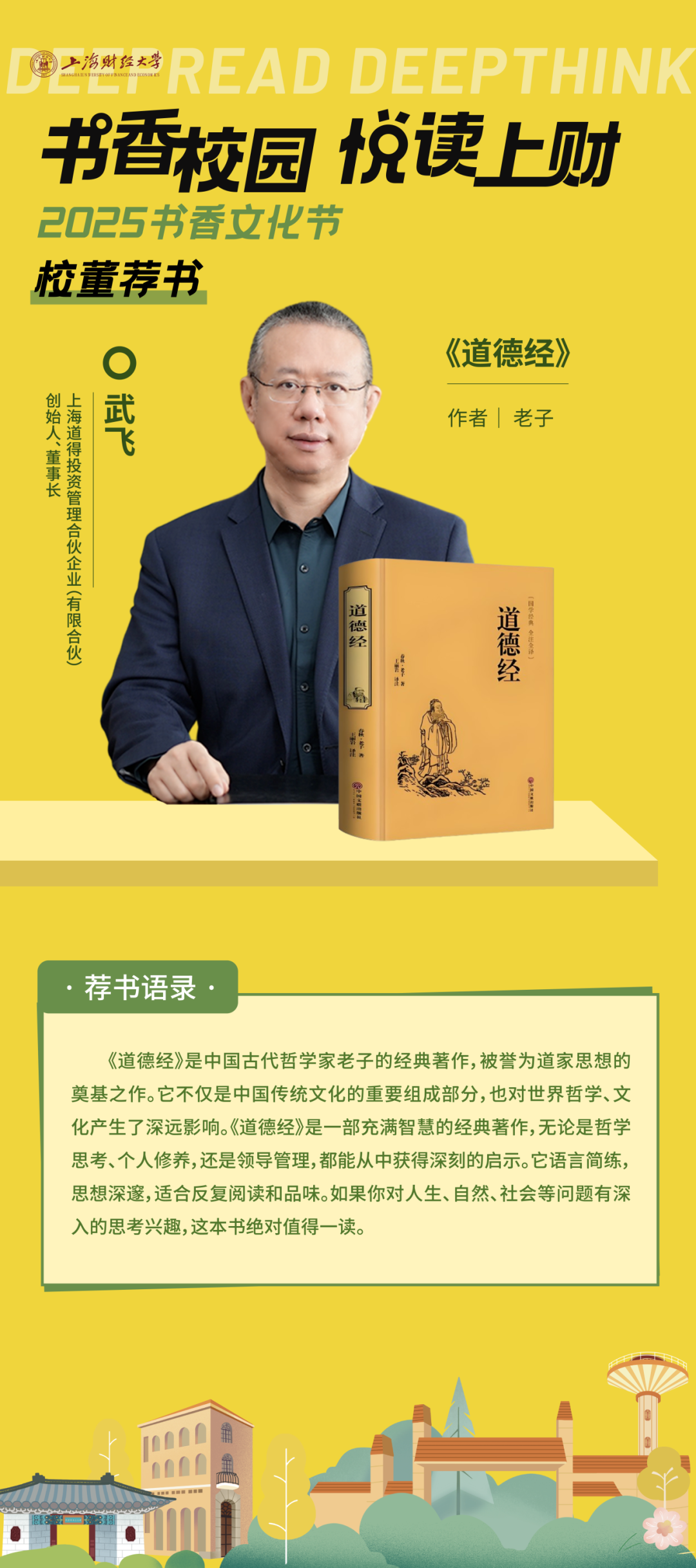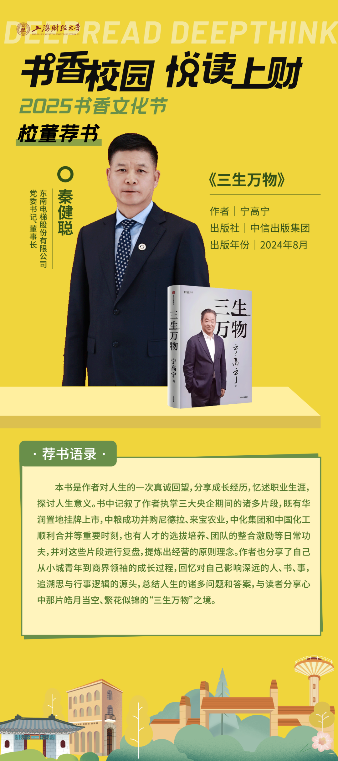 为营造浓郁的校园阅读氛围,丰富校园书香文化内涵,特邀校董、校友代表,为上财学子倾情推荐一本好书。激发同学们的阅读兴趣,唤醒阅读活力,助力同学们在书籍的海洋中,拓展知识的广度与深度,始终保持思想的敏锐与活跃,收获智慧的启迪,滋养浩然正气。让我们共同开启这场美妙的阅读之旅,解锁校董们的私藏书单(按姓氏笔画为序)。