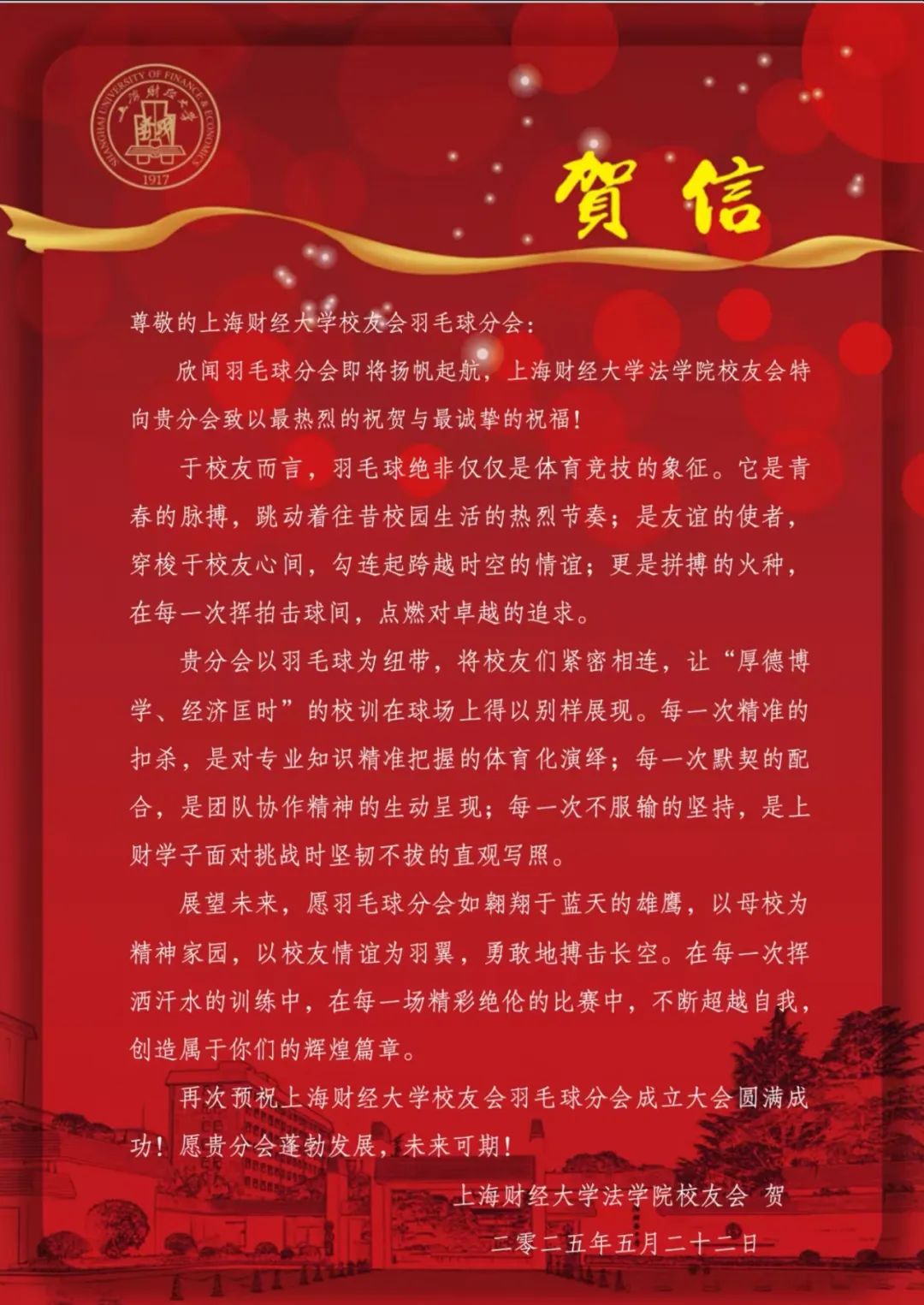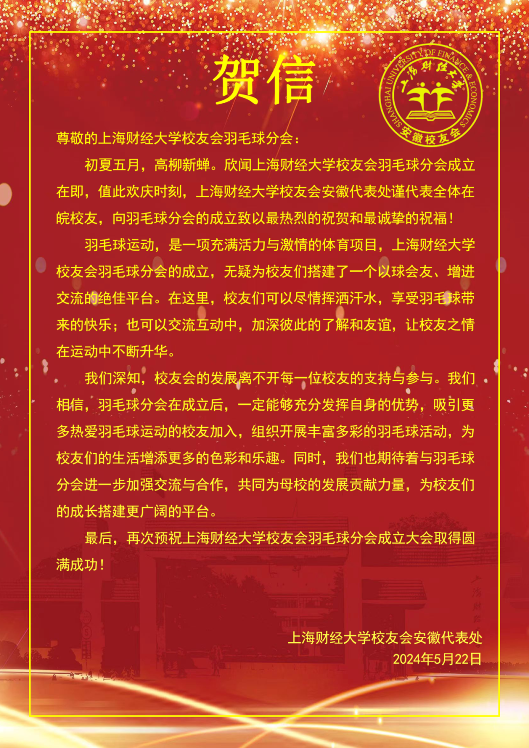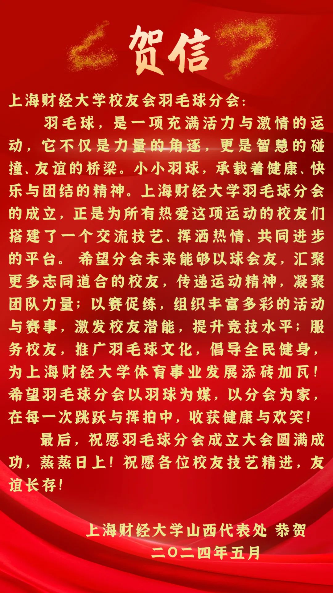 2025年5月24日,上海财经大学校友会羽毛球分会成立大会在万众期待中盛大举行。来自各地的校友、嘉宾齐聚一堂,共同见证这一承载着运动热情与校友情谊的重要时刻。从筹备期的精心策划到成立大会的圆满举办,每一个环节都彰显着上财人对羽毛球运动的热爱与对母校的深厚情怀。