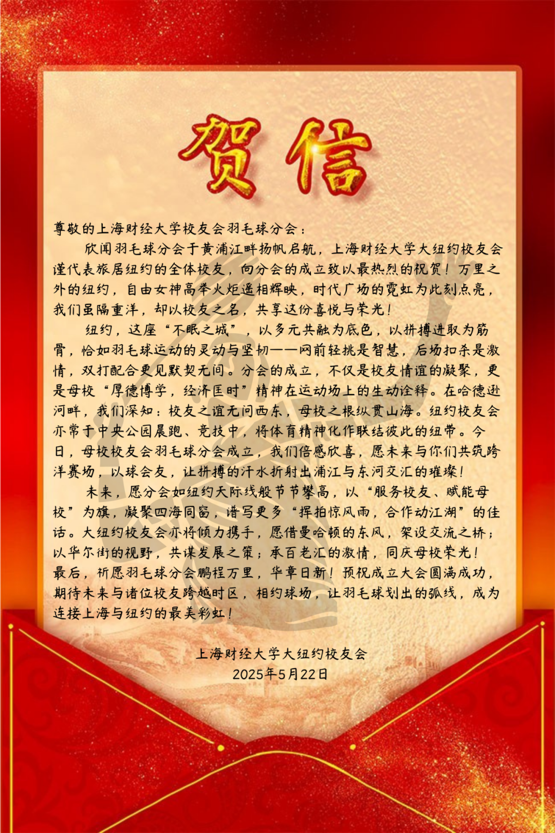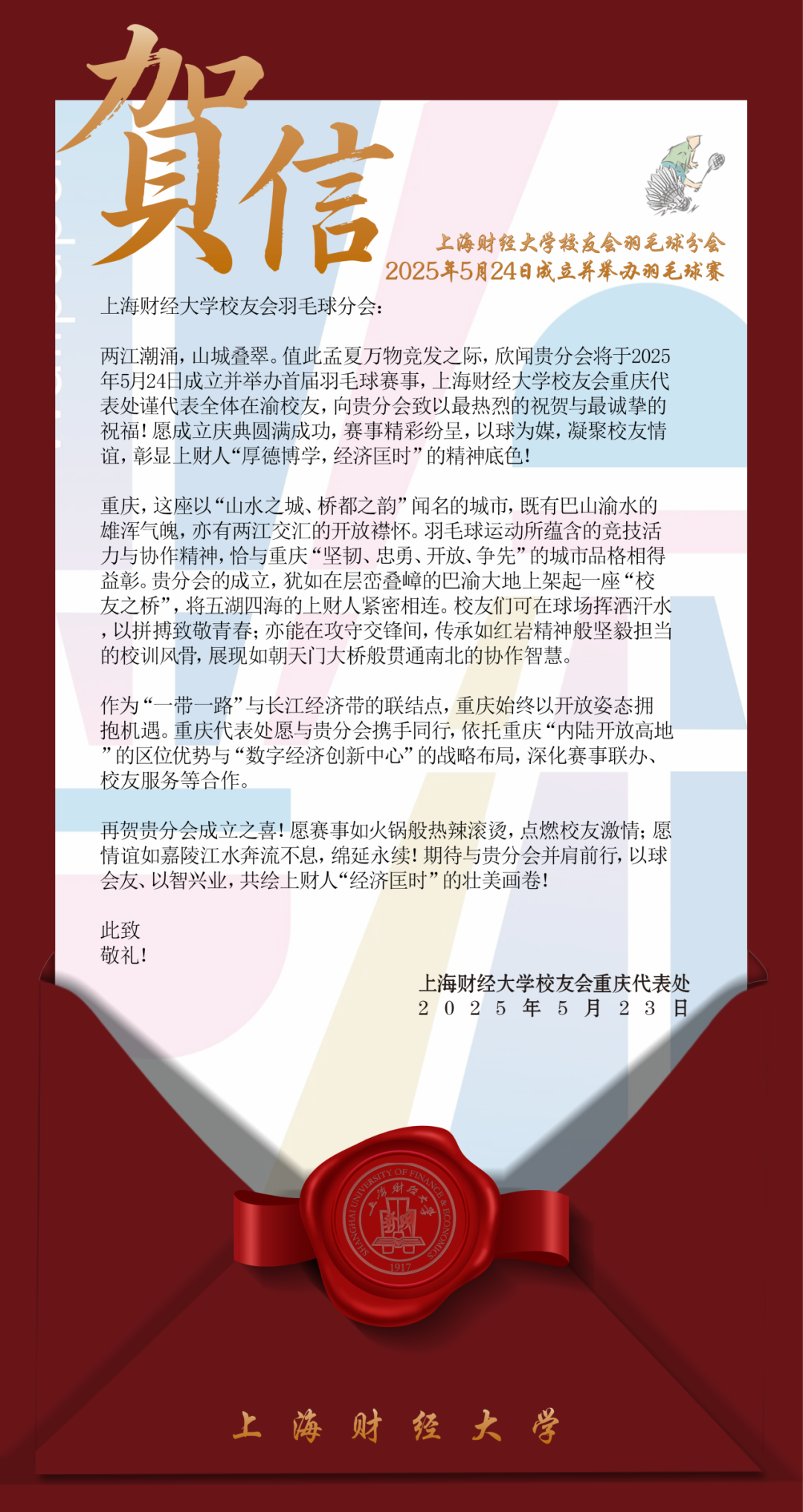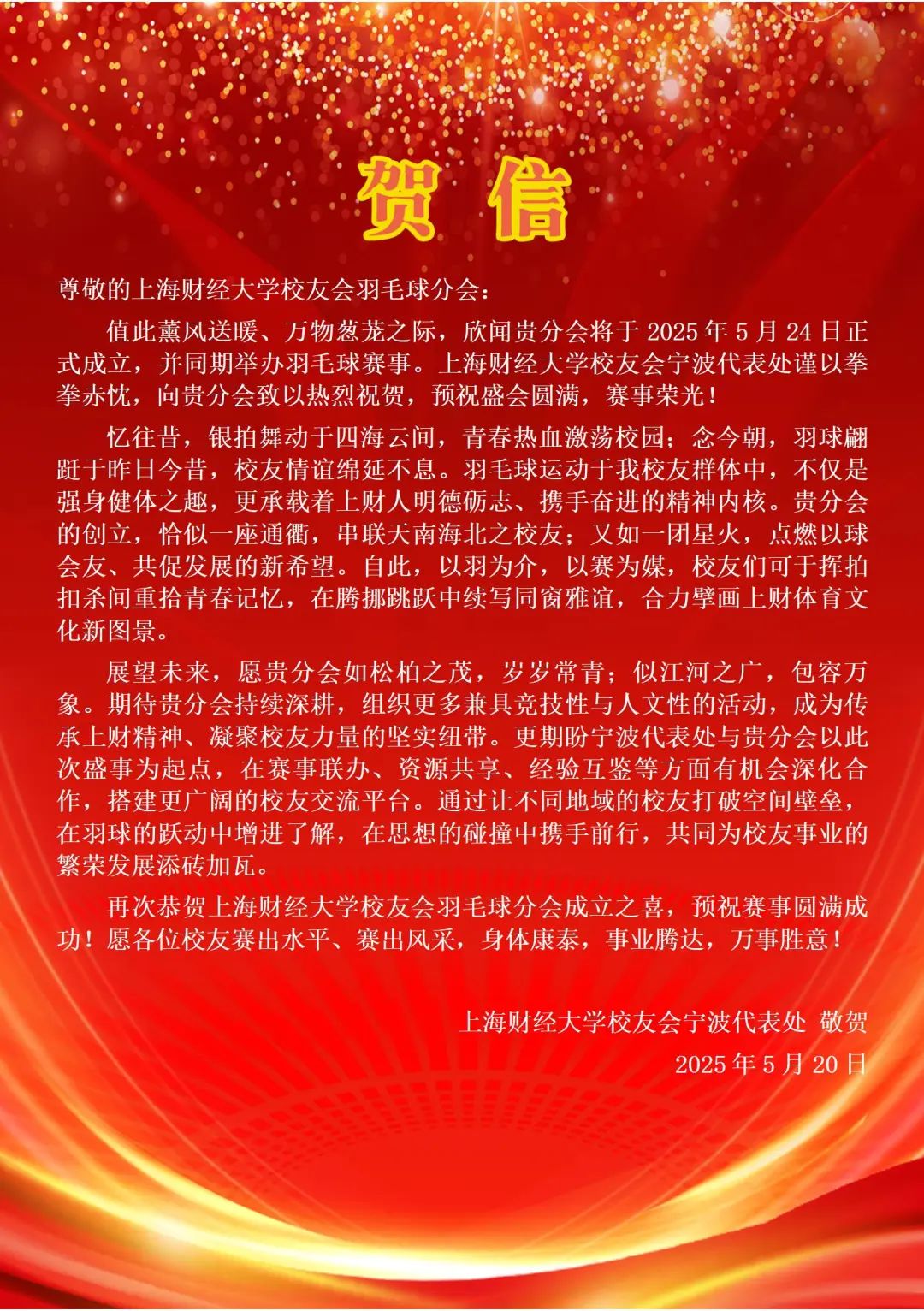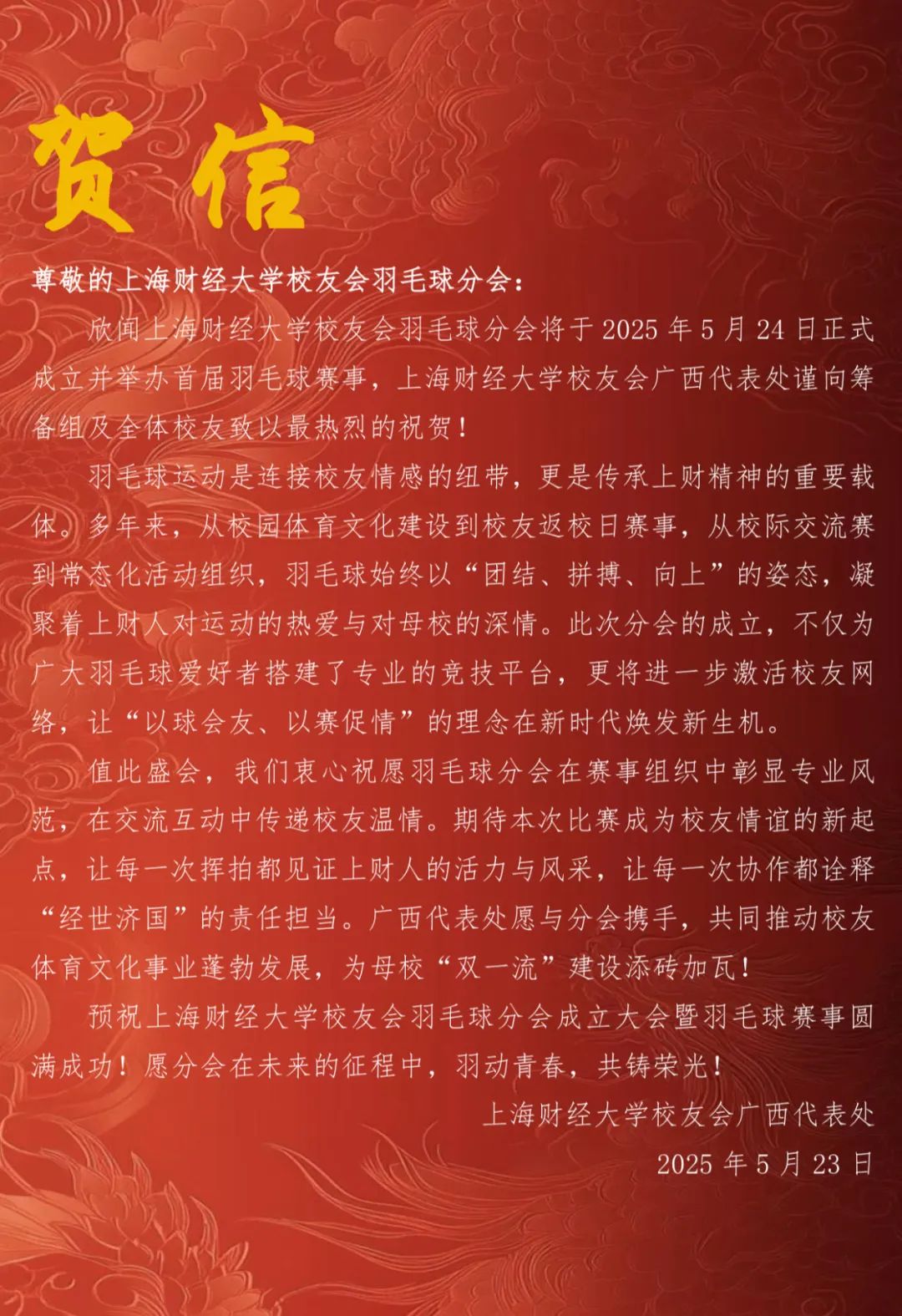 2025年5月24日,上海财经大学校友会羽毛球分会成立大会在万众期待中盛大举行。来自各地的校友、嘉宾齐聚一堂,共同见证这一承载着运动热情与校友情谊的重要时刻。从筹备期的精心策划到成立大会的圆满举办,每一个环节都彰显着上财人对羽毛球运动的热爱与对母校的深厚情怀。
