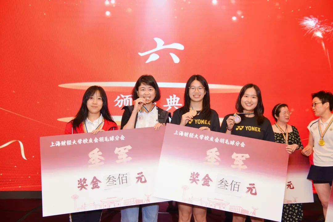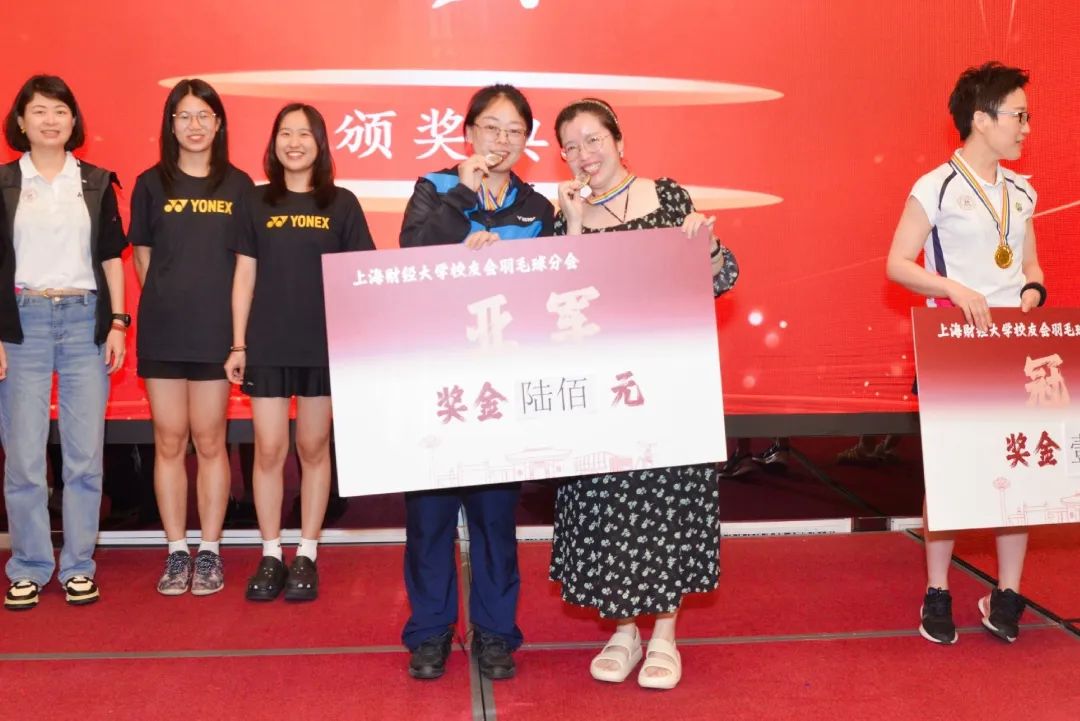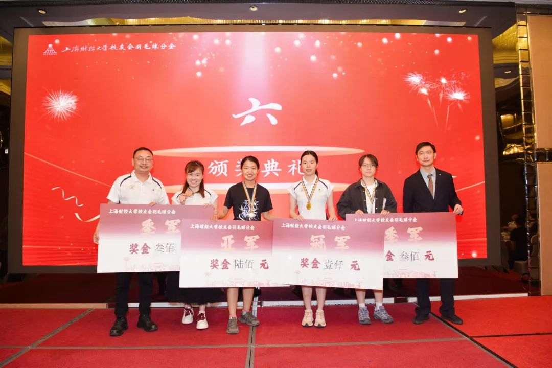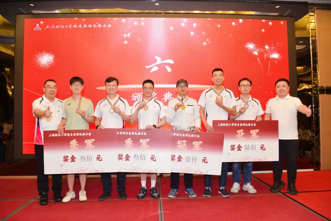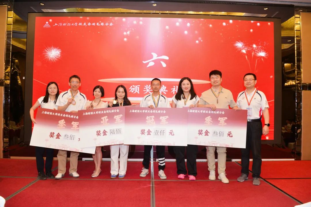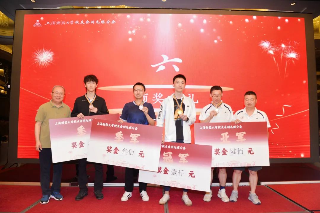 大会还为当日举行的上海财经大学校友会羽毛球分会第一届竞技赛单项赛举行了颁奖仪式。混双、女双、男双、女单、男单五个项目的获奖选手依次上台领奖,他们用汗水与热爱诠释了羽毛球运动的魅力,现场掌声雷动,向每一位拼搏的选手致敬。