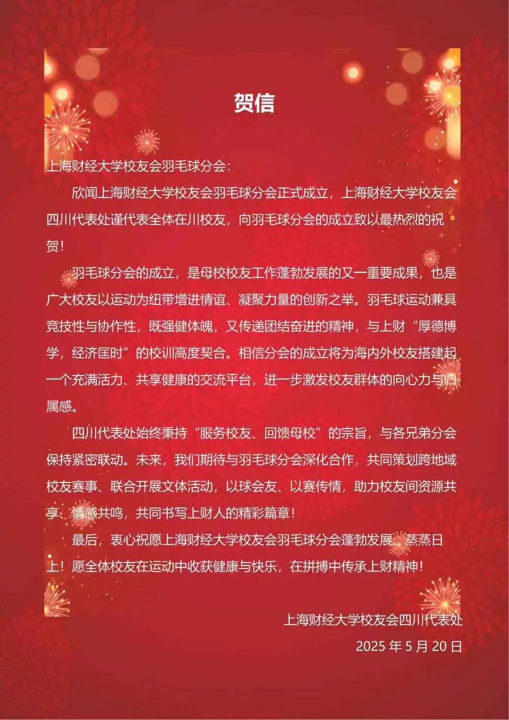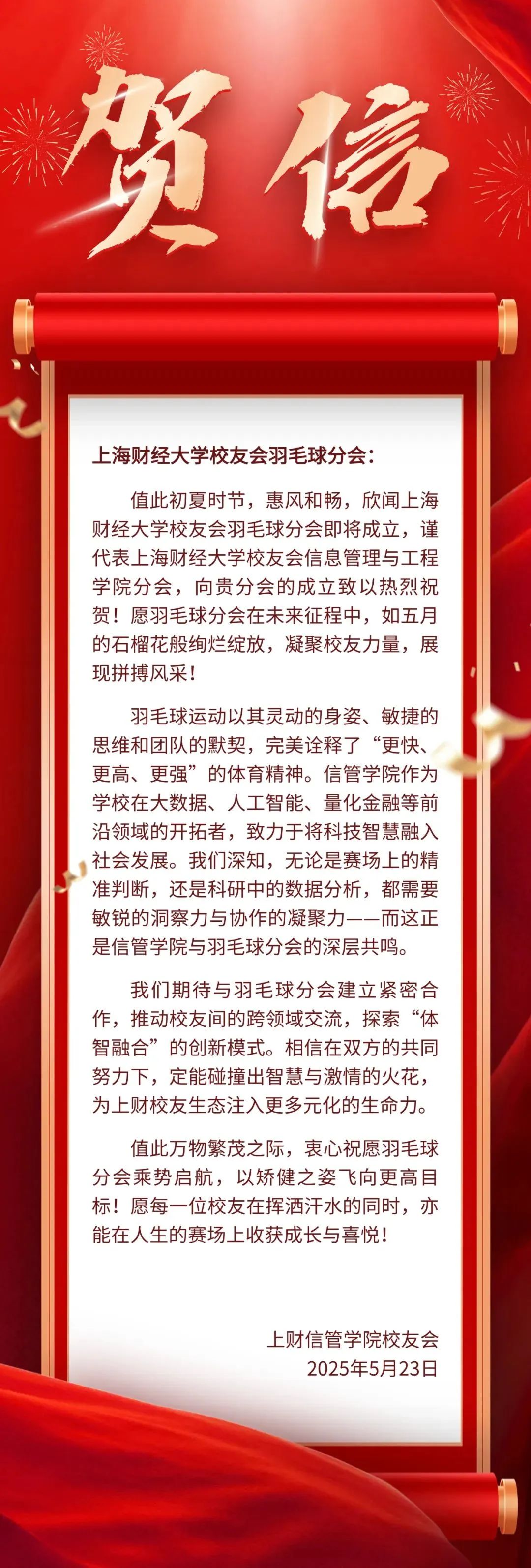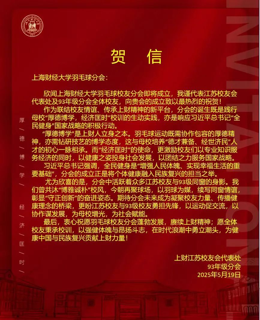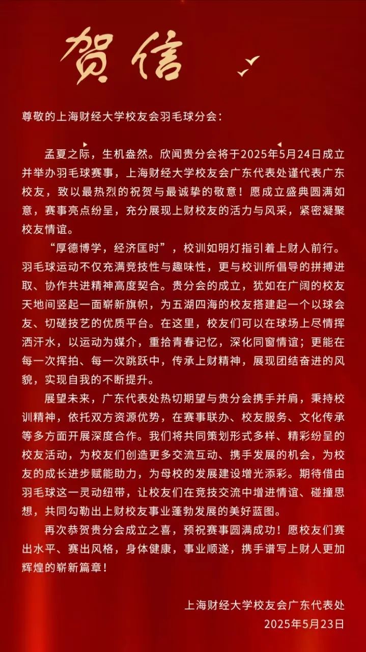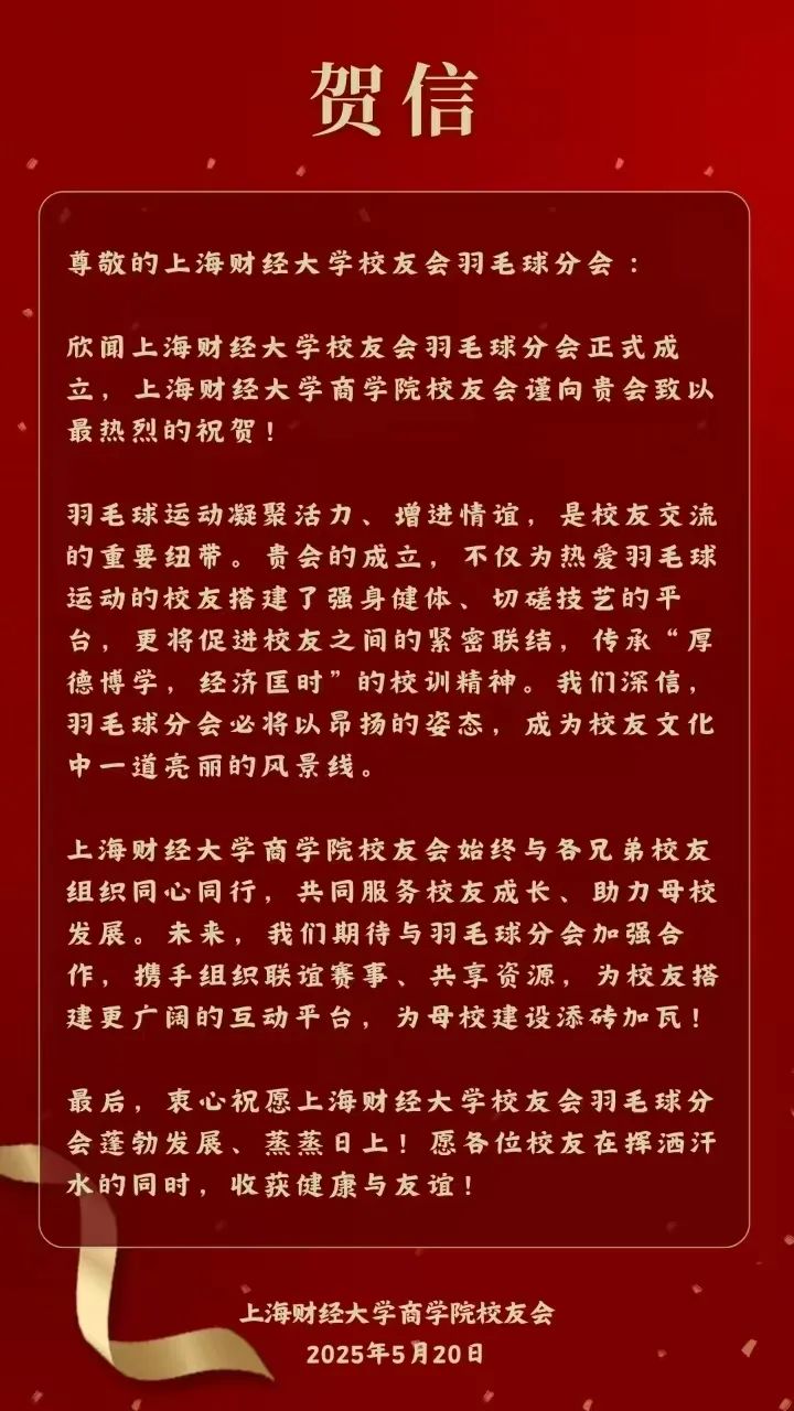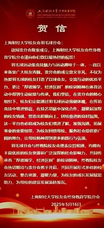 此次成立大会的圆满落幕,不是终点,而是全新的起点。正如李向锋会长在致辞中所说:“分会的意义不止于方寸球场、几度胜负。”上海财经大学校友会羽毛球分会将始终秉持“服务校友发展,服务母校发展,服务社会发展”的宗旨,以羽球为媒,凝聚校友力量,在运动中强健体魄,在交流中深化情谊,为校友们打造一个温暖有活力、专业有影响力的交流平台,共同为母校增光添彩,书写属于上财人的精彩篇章!