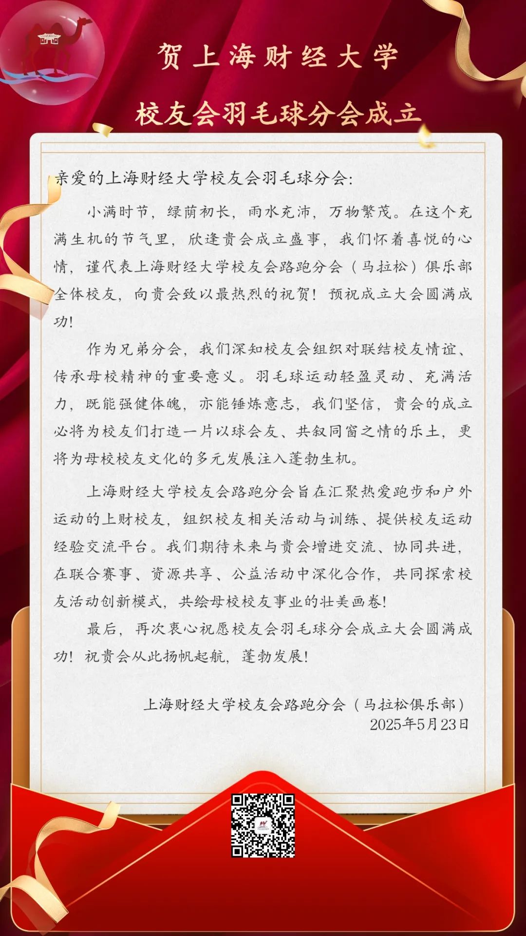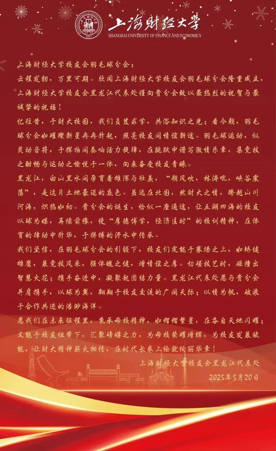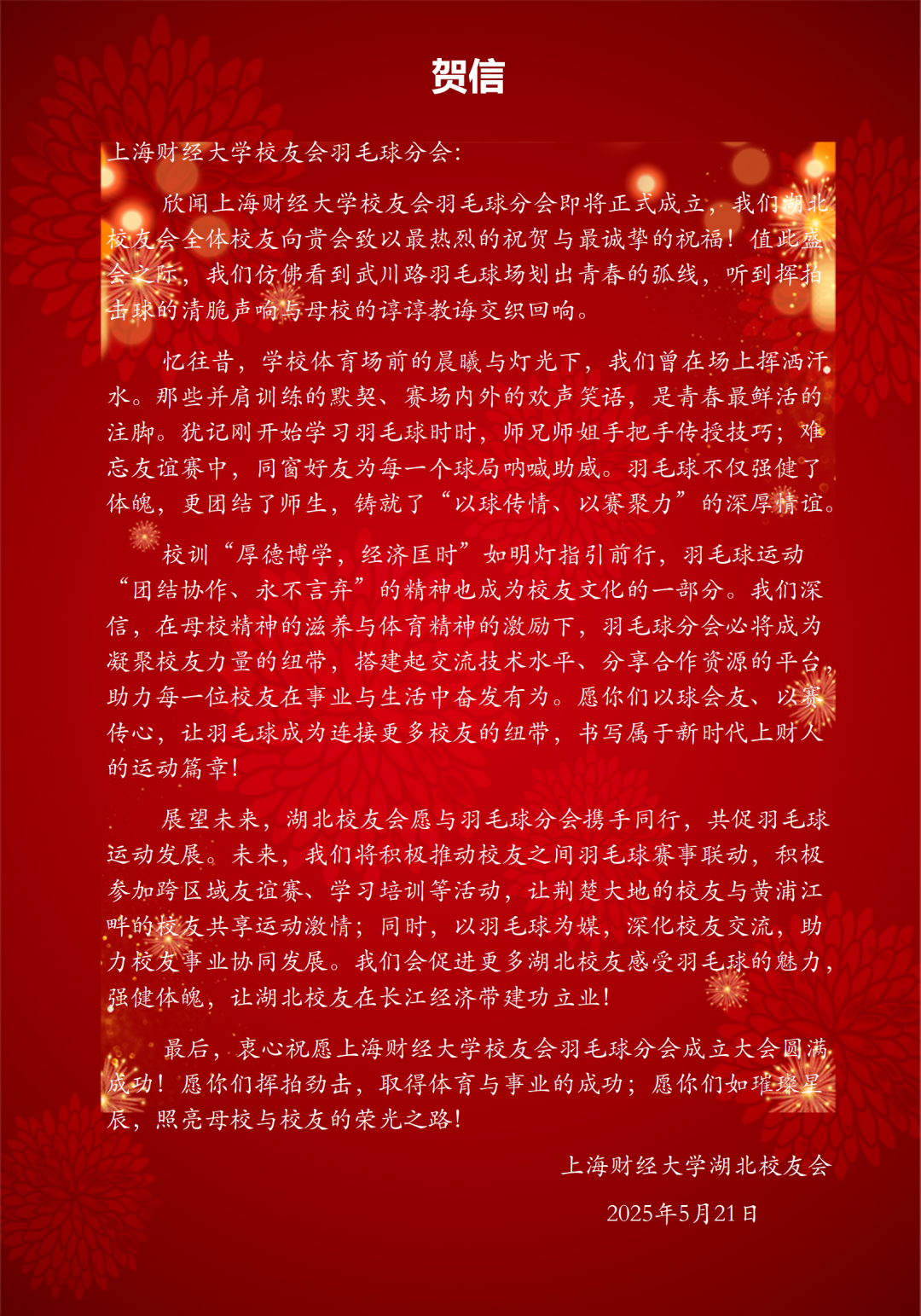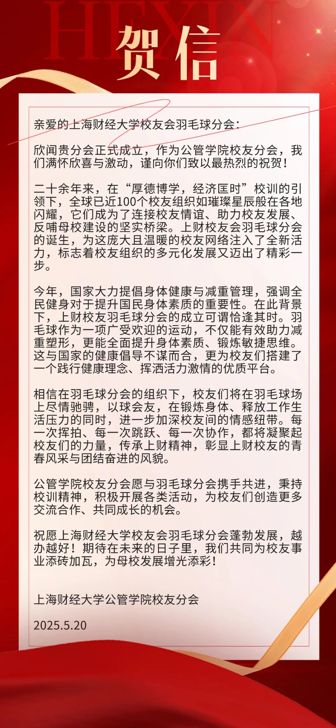 此次成立大会的圆满落幕,不是终点,而是全新的起点。正如李向锋会长在致辞中所说:“分会的意义不止于方寸球场、几度胜负。”上海财经大学校友会羽毛球分会将始终秉持“服务校友发展,服务母校发展,服务社会发展”的宗旨,以羽球为媒,凝聚校友力量,在运动中强健体魄,在交流中深化情谊,为校友们打造一个温暖有活力、专业有影响力的交流平台,共同为母校增光添彩,书写属于上财人的精彩篇章!