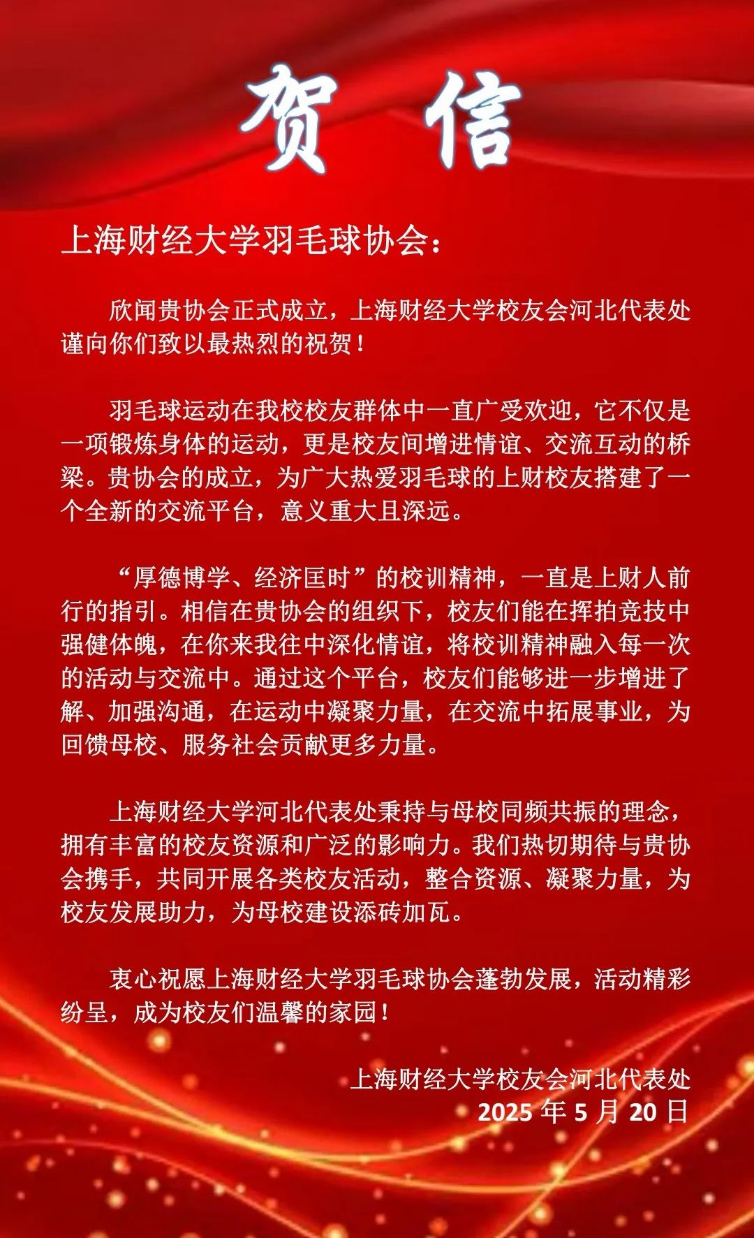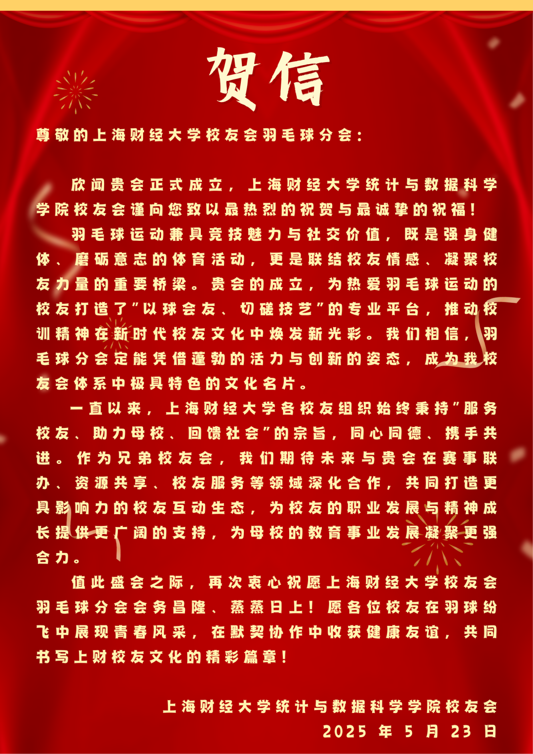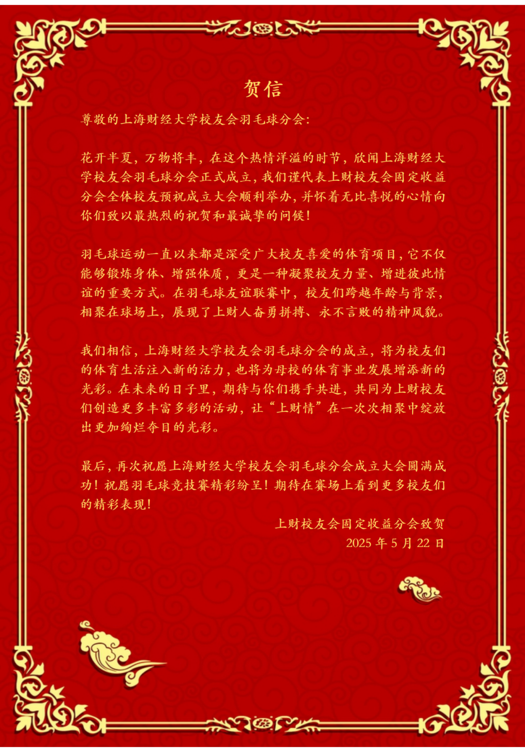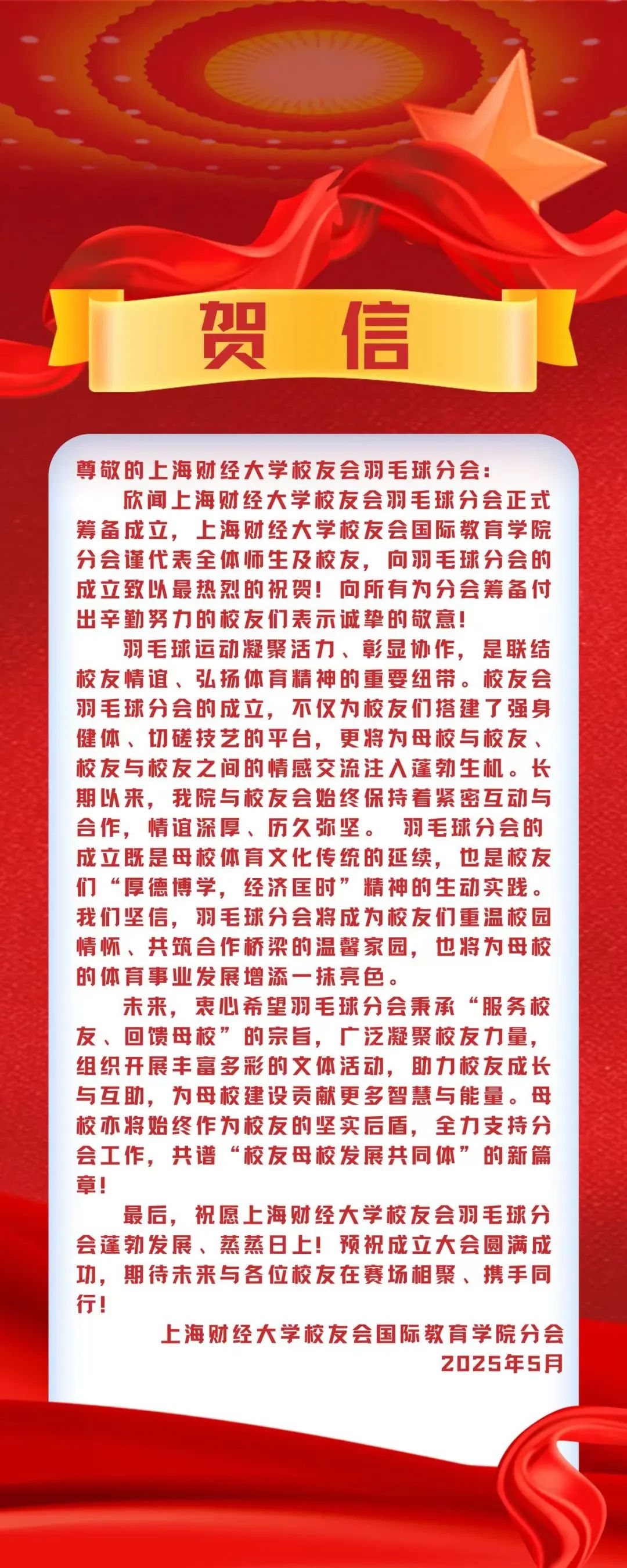 此次成立大会的圆满落幕,不是终点,而是全新的起点。正如李向锋会长在致辞中所说:“分会的意义不止于方寸球场、几度胜负。”上海财经大学校友会羽毛球分会将始终秉持“服务校友发展,服务母校发展,服务社会发展”的宗旨,以羽球为媒,凝聚校友力量,在运动中强健体魄,在交流中深化情谊,为校友们打造一个温暖有活力、专业有影响力的交流平台,共同为母校增光添彩,书写属于上财人的精彩篇章!