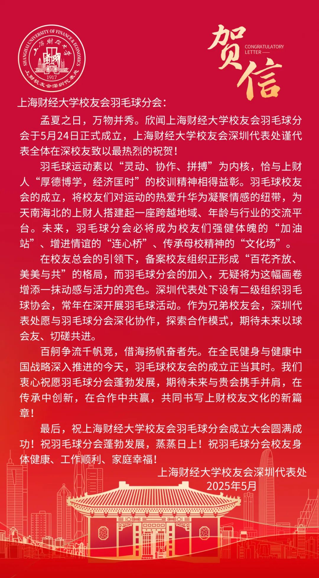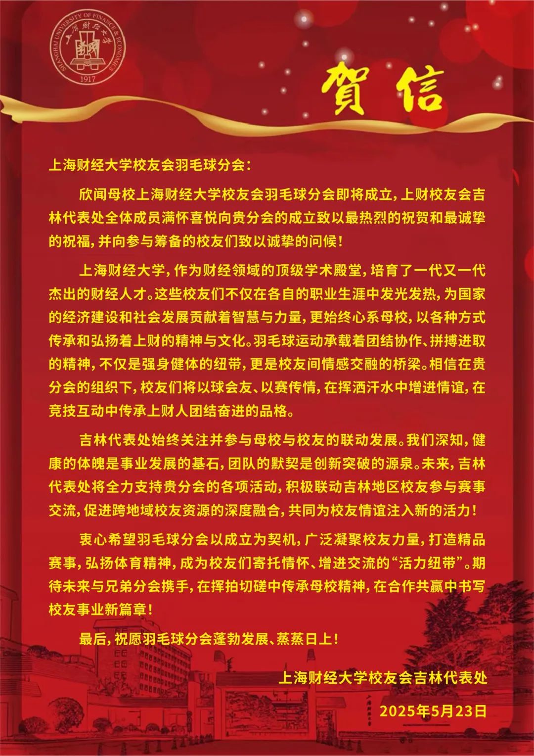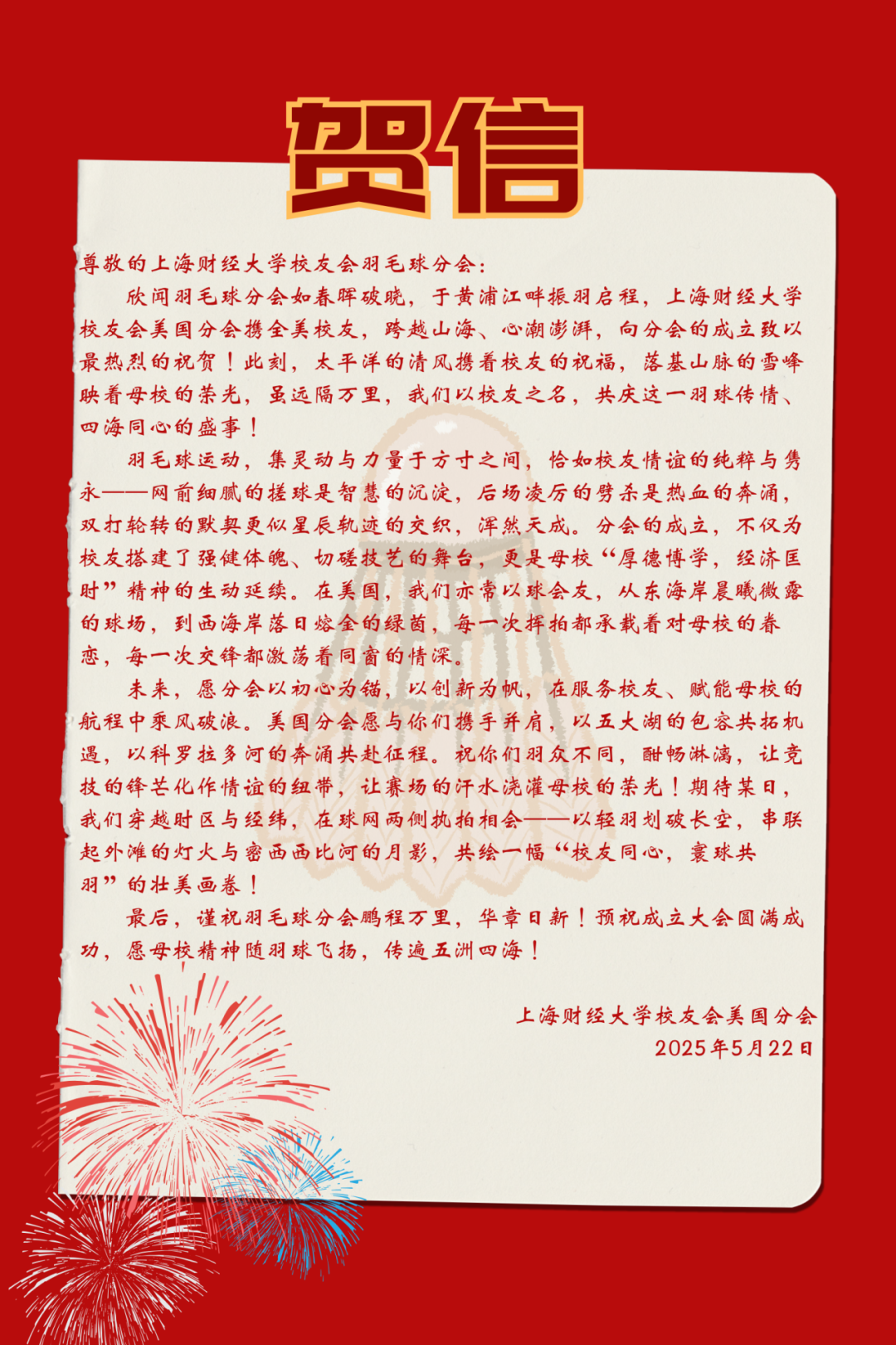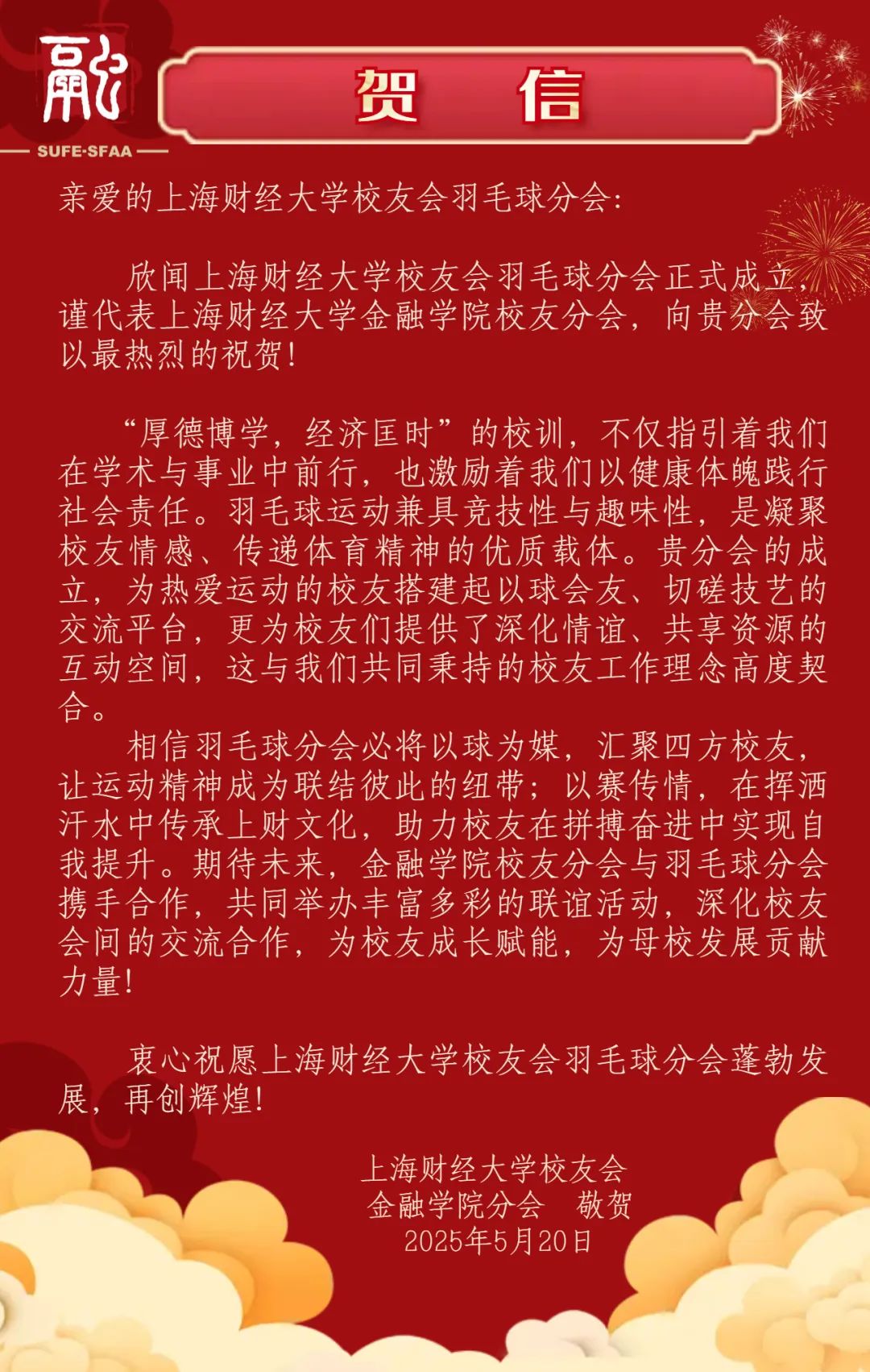 此次成立大会的圆满落幕,不是终点,而是全新的起点。正如李向锋会长在致辞中所说:“分会的意义不止于方寸球场、几度胜负。”上海财经大学校友会羽毛球分会将始终秉持“服务校友发展,服务母校发展,服务社会发展”的宗旨,以羽球为媒,凝聚校友力量,在运动中强健体魄,在交流中深化情谊,为校友们打造一个温暖有活力、专业有影响力的交流平台,共同为母校增光添彩,书写属于上财人的精彩篇章!