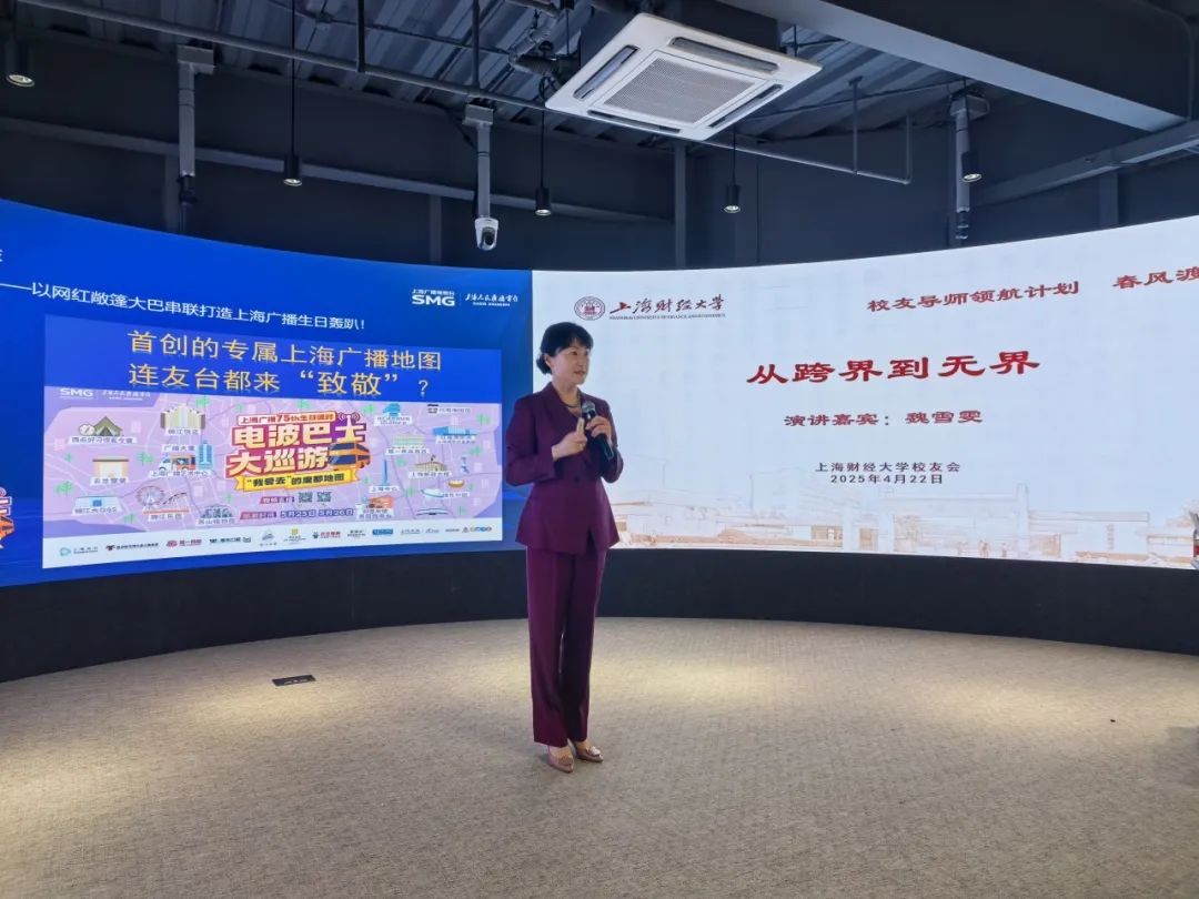 随后,魏雪雯校友结合多个实际案例,分享了她在财经融媒体IP打造、全媒体内容转型与平台运营中的实践经验。她指出,财经专业训练所带来的结构化思维、逻辑表达和商业敏感性,在传媒工作中具有显著优势,尤其在内容策划、项目统筹、传播策略等环节发挥了关键作用。通过介绍《财经早点》、《上海国企直播间》、《电波巴士大巡游》等品牌项目的创立与落地过程,她向同学们展示了主流媒体机构如何在媒体融合趋势下,通过内容创新与多元传播场景实现影响力延展和商业价值提升。