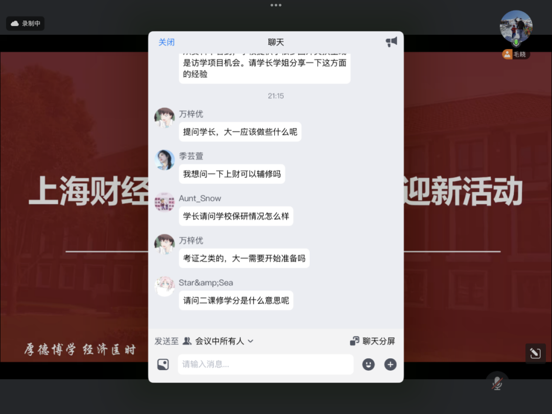 活动最后进入Q&A环节,由02级国际金融专业毛晓校友主持。新生们围绕“转专业细节”“国外交流项目”“实习资源获取”“大一规划重点”“辅修政策”“保研情况”“考证准备”“二课学分认定”等核心关切积极提问,在场校友与在校学长学姐耐心解答,用真实经验与专业信息为新生扫清困惑,进一步深化新老校友间的交流与共鸣。