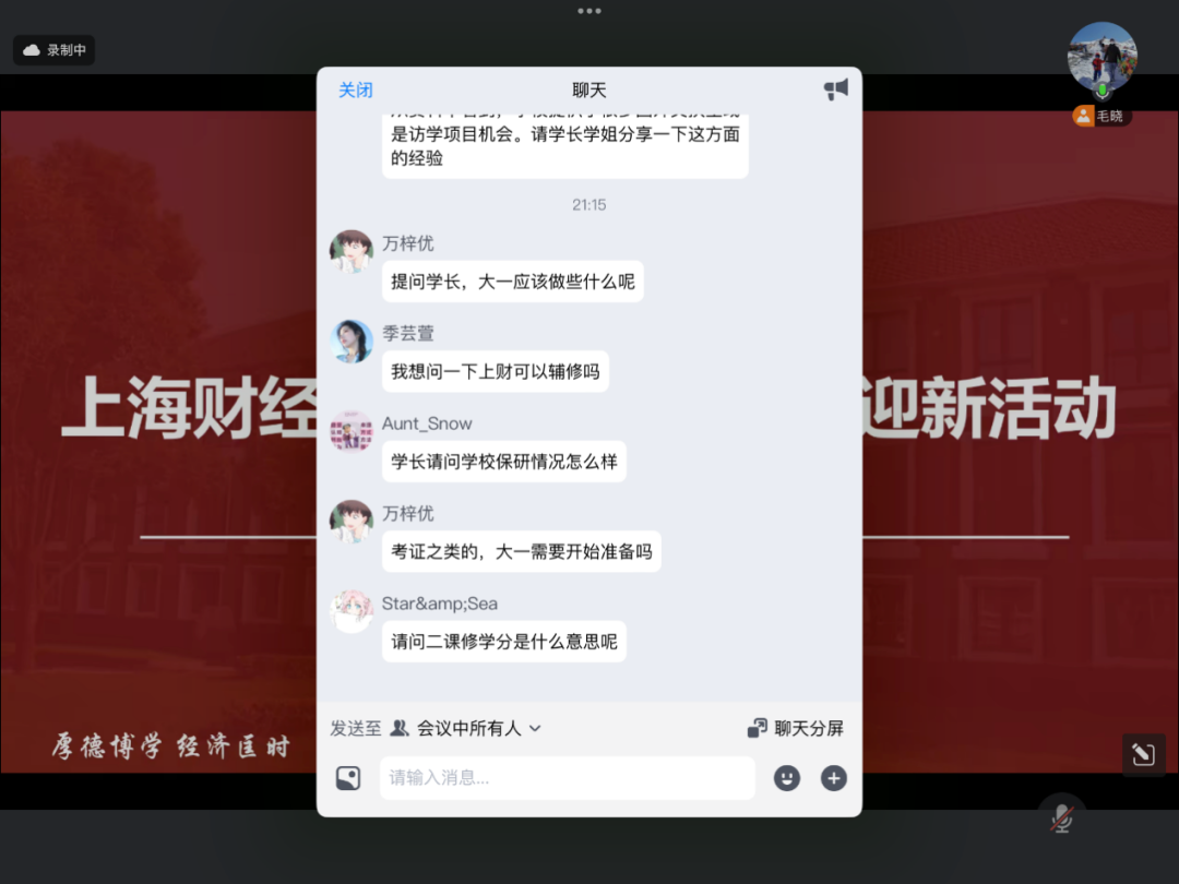 活动前夕,四川代表处秘书长、04级工商管理专业郭亮校友率先登场,详细介绍了本次云端见面会的流程安排与出席嘉宾,让在场新生提前明晰活动脉络。晚8时,活动准时启动,由24级投资学专业刘少毅同学担任主持,以亲切自然的风格引导整场活动有序开展。