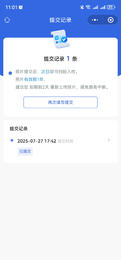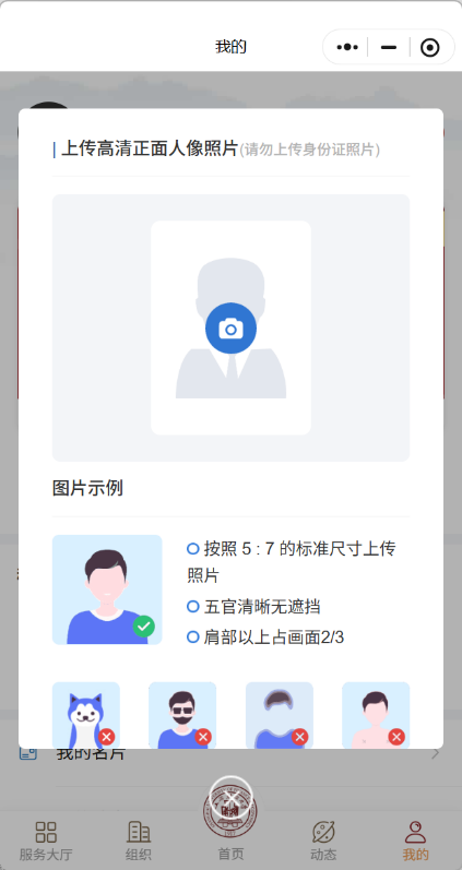 进入小程序的“服务大厅”,点击“人脸识别入校”端口,上传符号要求的人脸照片即完成申请。由于学校门禁系统每天的晚间自动同步人脸照片数据,校友在申请的第二天,可使用人脸入校功能。