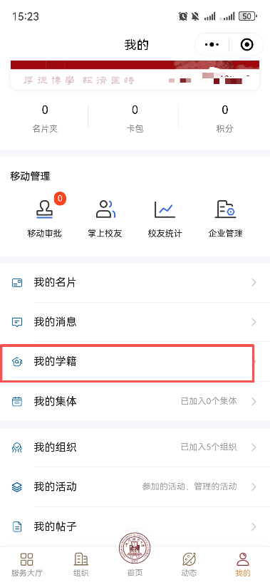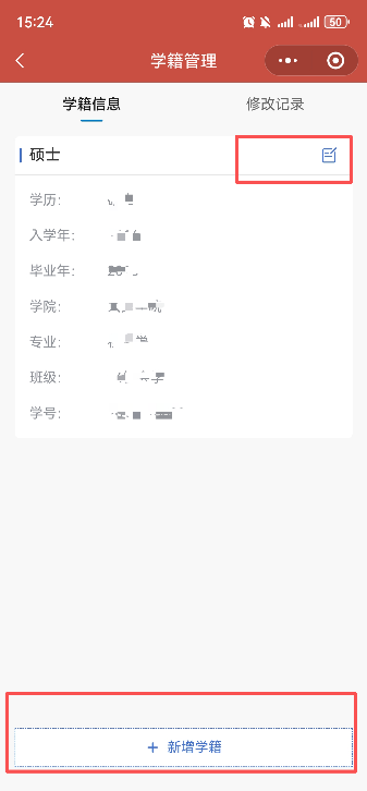 可以在“我的”页面,在“我的学籍”板块进行更正或新增。后台管理员审核后,就可以呈现正确完整的学籍信息。