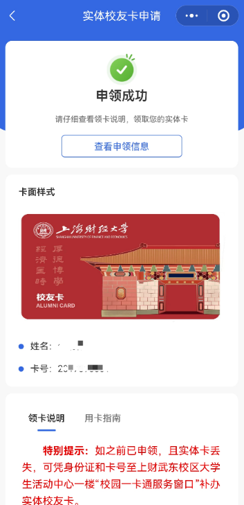 得到实体校友卡号,30分钟后,校友就可以在工作日到武东校区的大学生活动中心一楼校园卡窗口办理实体校友卡(卡务窗口具体工作时间详见申请页面)。