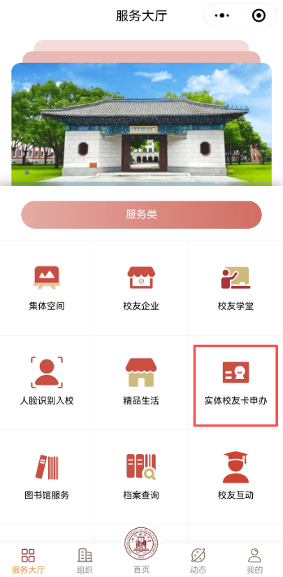 进入小程序的“服务大厅”,点击“实体校友卡申办”端口,就可以提交实体校友卡的申请。系统自动审核校友的申请需求,校友们在一分钟以内就能看到自己的实体校友卡卡号。