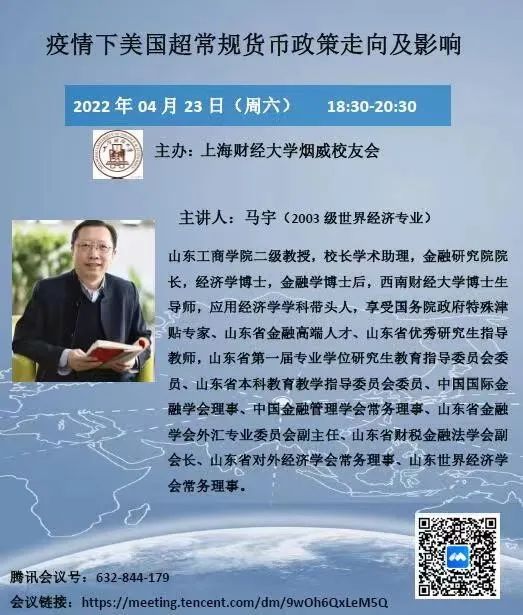 4月23日烟威校友会读书俱乐部邀请母校2003级校友马宇教授在线做了“疫情下美国超常规货币政策走向及影响”的学术报告,并与部分校友进行了在线互动交流,众多校友参与了此活动,反响热烈。