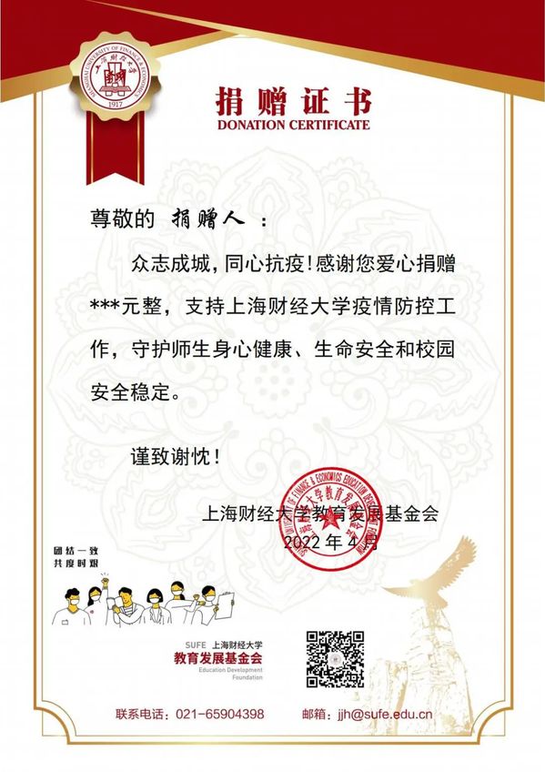 自三月抗击新冠疫情以来,广大校友、校董、家长、爱心单位及社会各界纷纷关切学校抗疫情况,主动联系捐赠,截止到2022年4月27日15时,向上海财经大学教育发展基金会汇入抗疫专项捐赠资金累计964.28万元,共计1579笔(捐赠详情点击文末“阅读原文”),与学校共克时艰、守护师生们的健康平安。您的每一份爱心捐赠,都筑成校内师生的坚实防护堡垒,让我们更有信心和底气坚强应对严峻的防疫形势。
