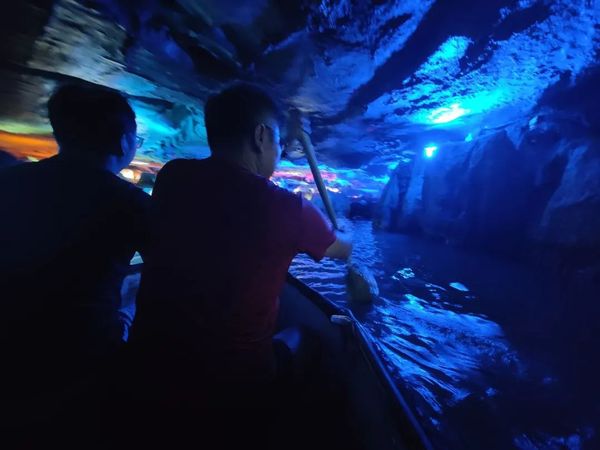 我们分坐于两条船上,泛舟河内,宽处如浩瀚西湖,窄处又如蜿蜒曲折的三峡,悠闲时可赏地下龙宫般的山水景观,船技不佳时又有担心随时触礁的惊呼,整体玩赏性极佳。