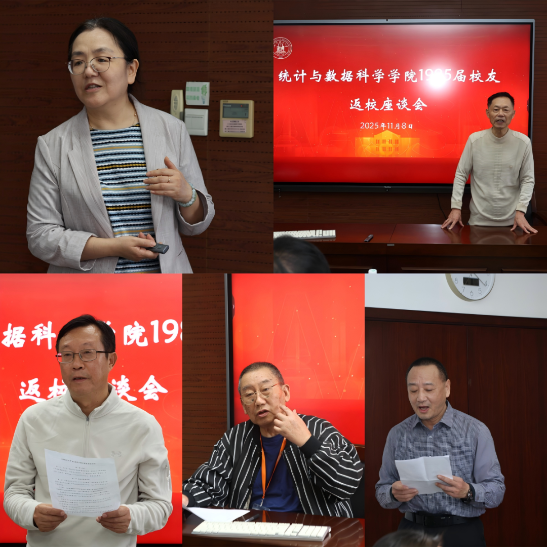 85届、05届校友们一早陆续来到学院楼前,久别重逢的招呼声此起彼伏,空气一下子热了起来。在学院1208会议室内,85届校友开展毕业40年的班会活动。统计与数据科学学院党委书记杨晖代表学院向远道而来的校友们致以最热烈的欢迎和最诚挚的问候。她详细介绍了学院近年来在各方面的发展概况,从学科简介到师资队伍建设,从人才培养到科学研究,从社会服务到校友工作,每一项成果都凝聚着学院师生的心血与汗水。随着数据科学和数字经济的蓬勃发展,统计学科迎来了前所未有的机遇,前景广阔,大有可为,希望校友们能继续关注学院的发展,为学院的进步出谋划策。
