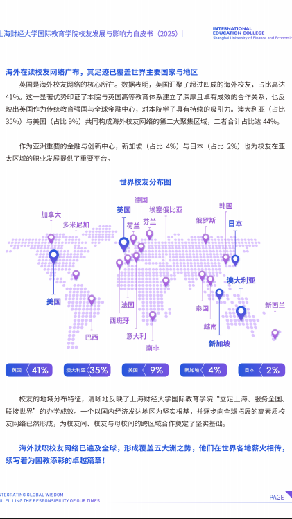 本次大会上,《上海财经大学国际教育学院校友发展与影响力白皮书(2025)》正式发布。该白皮书基于3538份有效问卷和30余场深度访谈,通过系统数据分析,全面呈现了校友群体的地域分布、学业成就、职业发展等维度的发展轨迹与社会影响力。白皮书的发布不仅为学院办学质量提供了实证支撑,也为优化人才培养模式提供了重要参考,更是学院积极响应国家留学报国号召的体现。