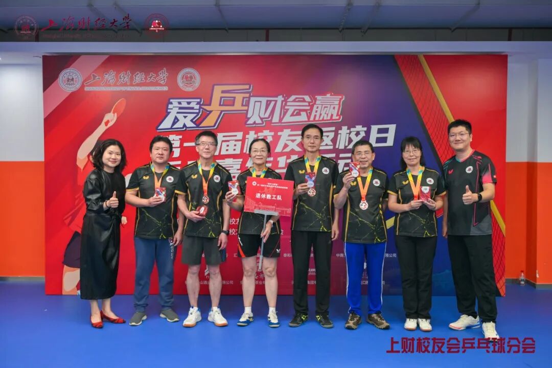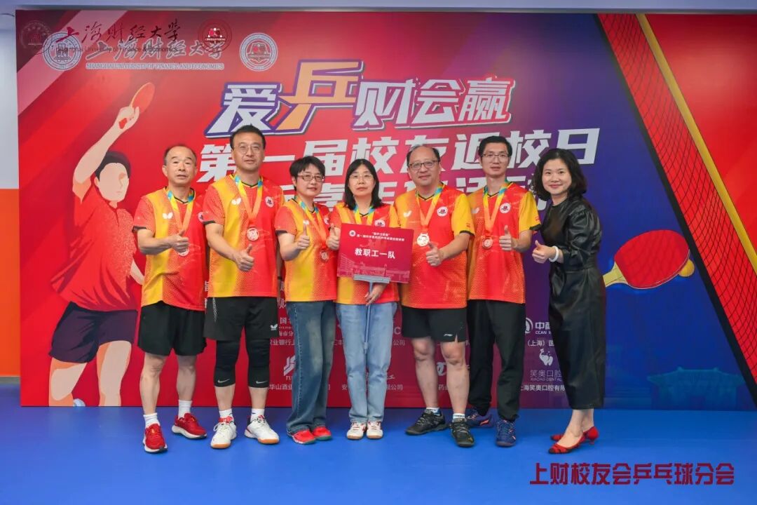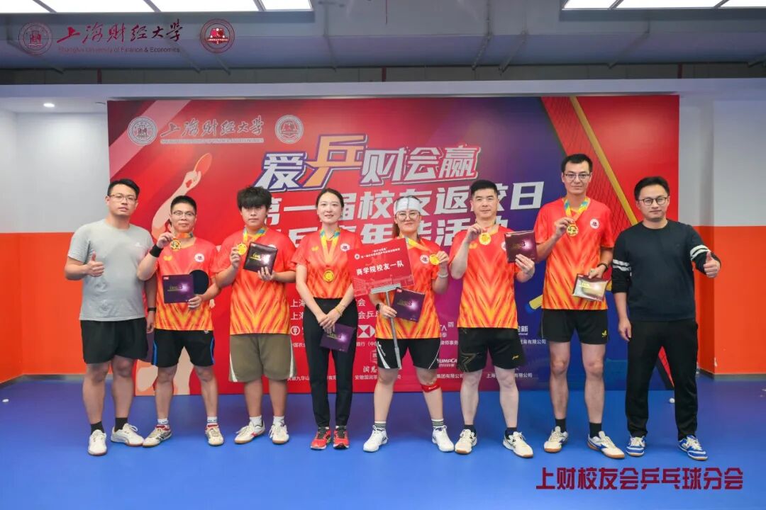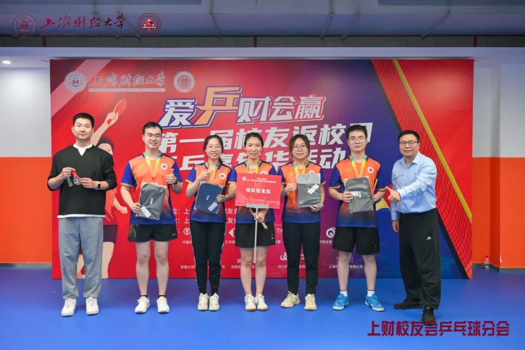 颁奖仪式上,乒乓球分会会长唐尧与上海财经大学团委副书记任斌老师为冠军队伍商学院校友一队颁奖,乒乓球分会秘书长兼副会长夏立与副会长沈元卿为亚军队伍安徽校友会队颁奖,乒乓球分会副会长卢春明与副会长尚银龙为季军队伍校队校友队颁奖, 乒乓球分会副会长黄丹青与为上海财经大学经济学院黄振兴老师为第四名队伍退休教工队颁奖,教职工一队、校友混合五队、商学院校友二队、教职工三队荣膺本次赛事的并列第五名。