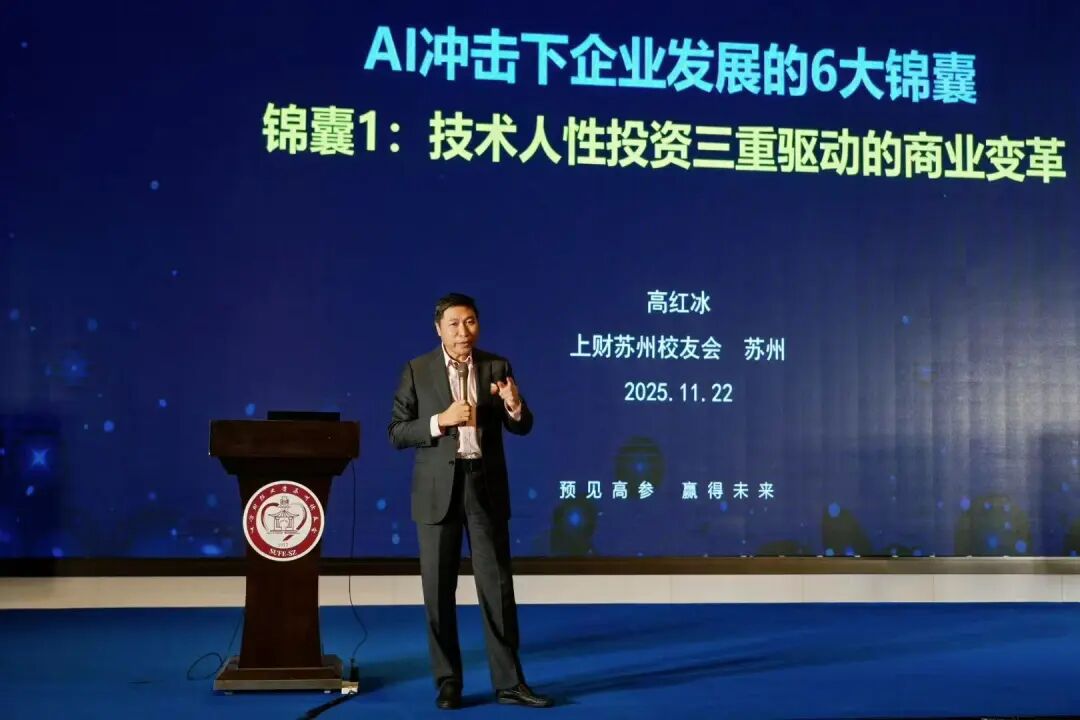 在主旨演讲环节,数字经济研究院院长高红冰以《技术人性投资三重驱动的商业变革》为题分享真知灼见,并介绍了上财数字经济研究院及“高参学堂”的新动向,为企业家和校友提供了高层次学习交流平台。
