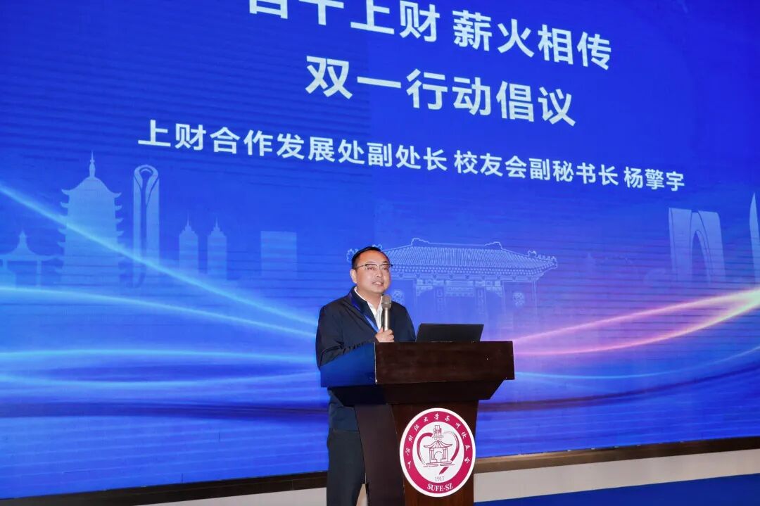 上海财经大学合作发展处副处长杨擎宇宣讲了“百十上财 薪火相传 双一行动倡议”,介绍了上财新版校友服务系统。他号召校友们积极参与支持母校建设,向母校110周年华诞献礼。