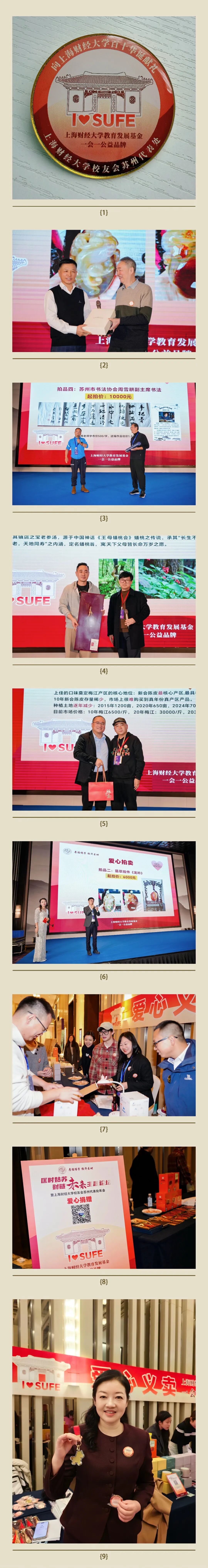 感谢上海财经大学校友会苏州代表处张志华顾问、董立、上海财经大学校友会吉林校友会卢晟杰、商学院校友贾德民捐赠爱心拍品。感谢徐琼理事捐赠红木文创品用于爱心义卖。