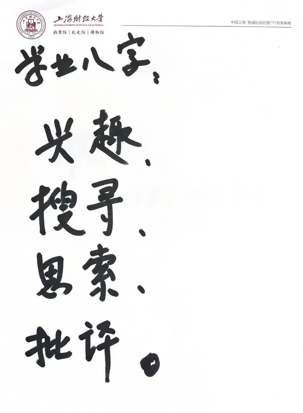 访谈最后,朱钟棣校友表达了对母校深切的感激与祝福。他为青年学子题词“学业八字”:“兴趣(Interesting)、搜寻(Seeking)、思辨(Thinking)、批评(Criticizing)”。他解释到:“求学过程中,首先要找到真正的兴趣所在;其次要广泛搜寻知识;继而要勤于思考辨析;最终要形成独立的批判精神”。他希望上财学子能扎根中国大地,兼具国际视野,在新时代的经济学领域不断探索,贡献力量。