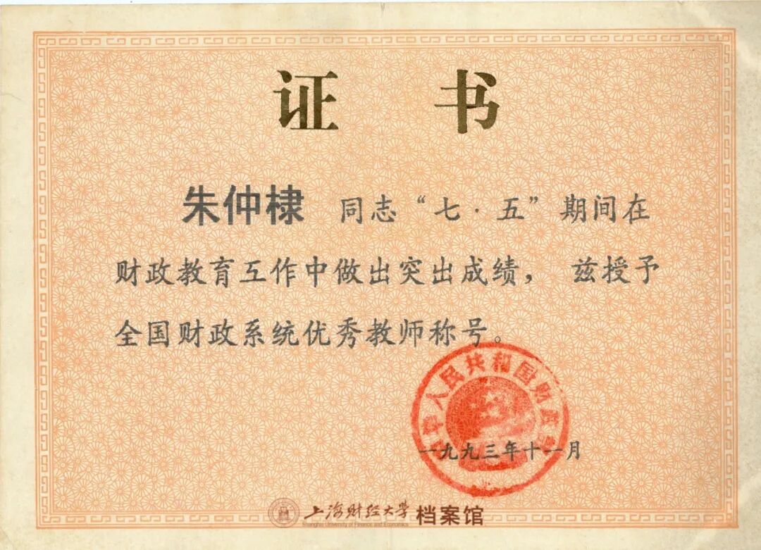 1993年11月,朱钟棣获全国财政系统优秀教师称号