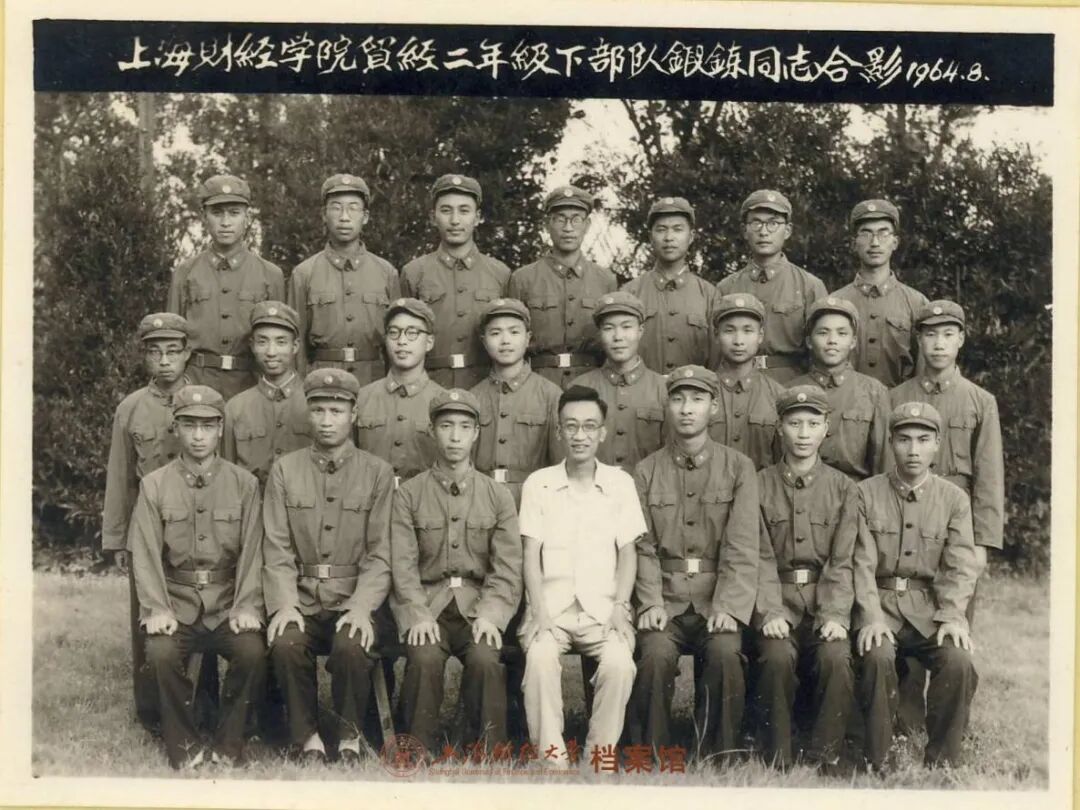 1964年8月,上海财经学院贸经二年级下部队锻炼同志合影(前排左起:高剑佩、张文德、周锡樵、周敦生、朱钟棣、房宜生、严汝勋;二排左起:张锡根、阮正福、王一鸣、花家毅、刘建华、金忠义、周洪林、曹渭泉;三排左起:章丽周、高子良、崔圣元、林濡元、翁全龙、胡文元、周汉璋)