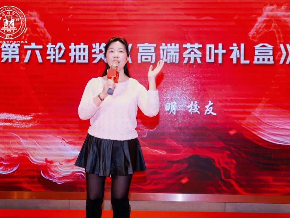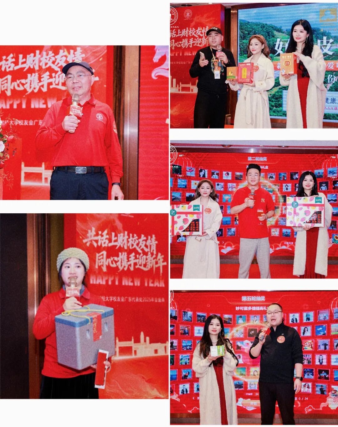 抽奖环节更是全场焦点,气氛热烈高涨、高潮迭起。贾德民校友赞助陈皮礼盒,吴远恒校友赞助英德红茶礼盒,刘鎏校友赞助高端宏福柿,陈妍婷校友赞助潮汕生鲜礼品卡,梅律校友赞助妙可蓝多捷捷高礼盒,一轮轮好礼接连送出,惊喜不停。