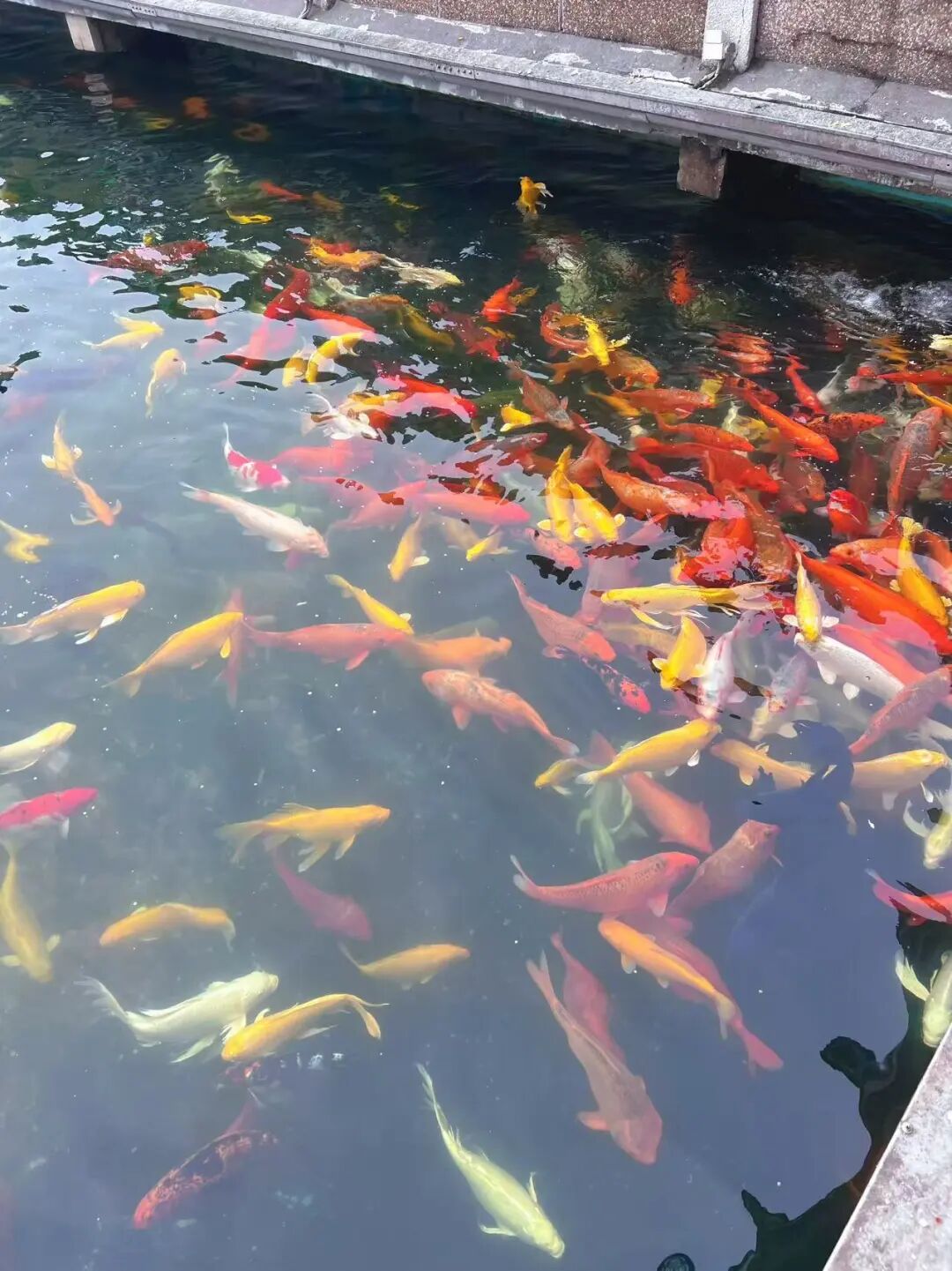 出楼沿湖边大道右行,欣赏着湖边成排高耸挺拔的水杉和漫漫东湖的水天一色。不久便到了碧潭观鱼景区。划分成一片片的水池中,五彩锦鲤、黝黑青鱼畅游其间,时不时争相跃起,抢夺着游客抛下的美味铒食,逗出池边小朋友们的阵阵欢叫。