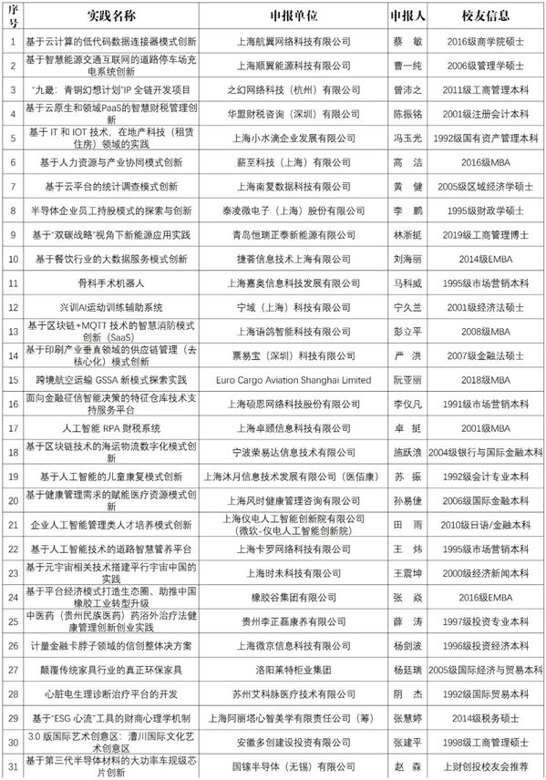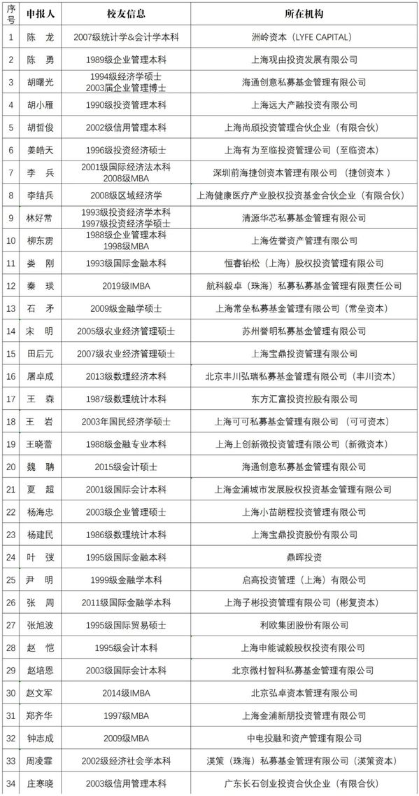 经各兄弟校友会推荐和校友自荐,本次评选共收到超过120份校友及校友企业的报名。通过实地走访、背景调查等初审,并报送各相关专家评委会评审,现有31个实践案例、34位投资人、38位专业人入围“创新创业最佳实践”、“优秀投资人”、“卓越专业人”获奖大名单,现予以公示。