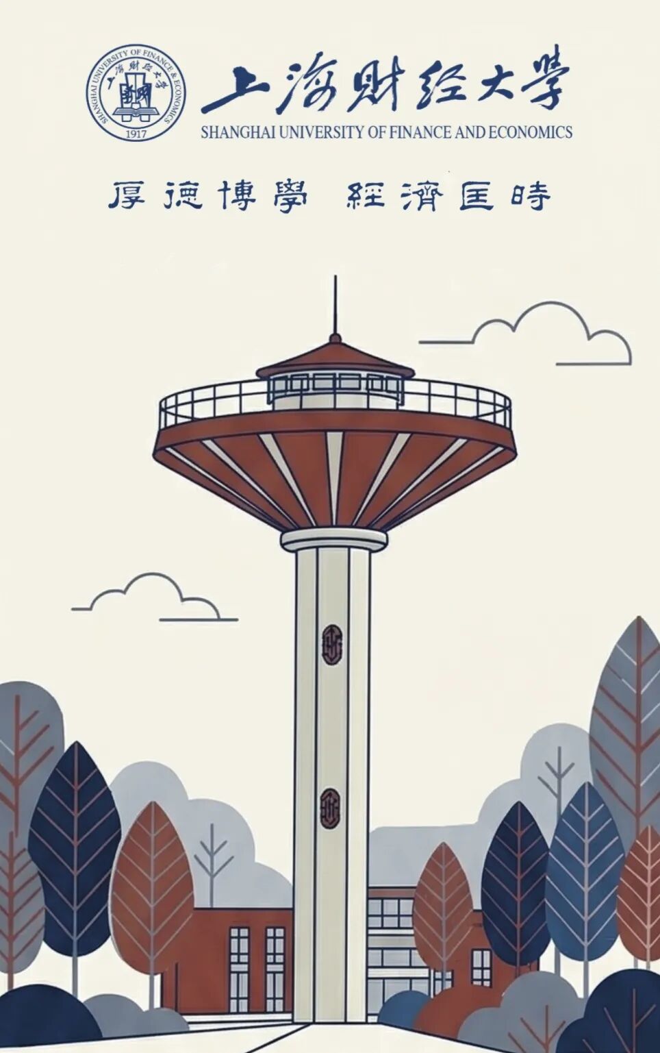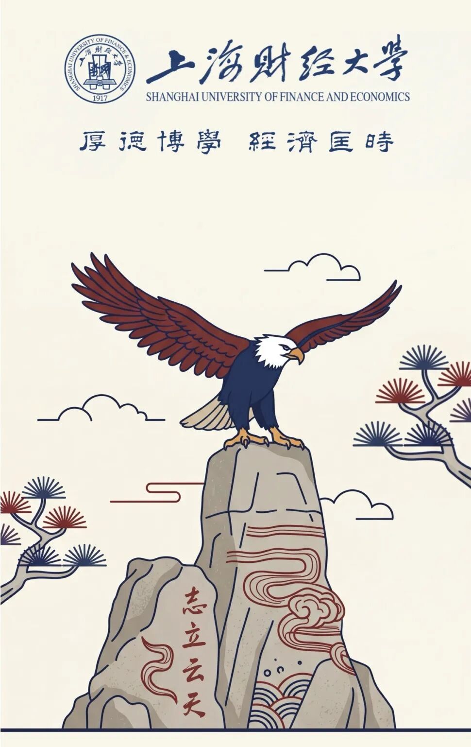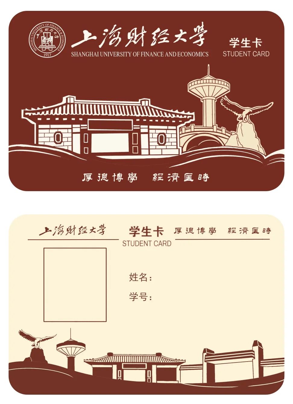 设计理念:本设计以“财韵新章,卡载芳华”为理念,提取上财鹰、水塔、老校门、新校门等标志性建筑,构建兼具历史感与时代感的校园视觉符号。老校门与水塔承载学校深厚文脉与集体记忆,新校门象征开放进取、面向未来,上财鹰寓意高远志向与拼搏精神。色彩选用上财红与蓝,分别体现庄重厚重的人文底蕴与理性开阔的学术气质,整体呼应“厚德博学,经济匡时”的上财文化精神。