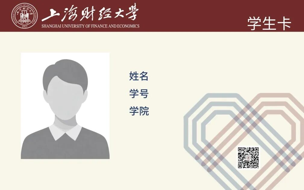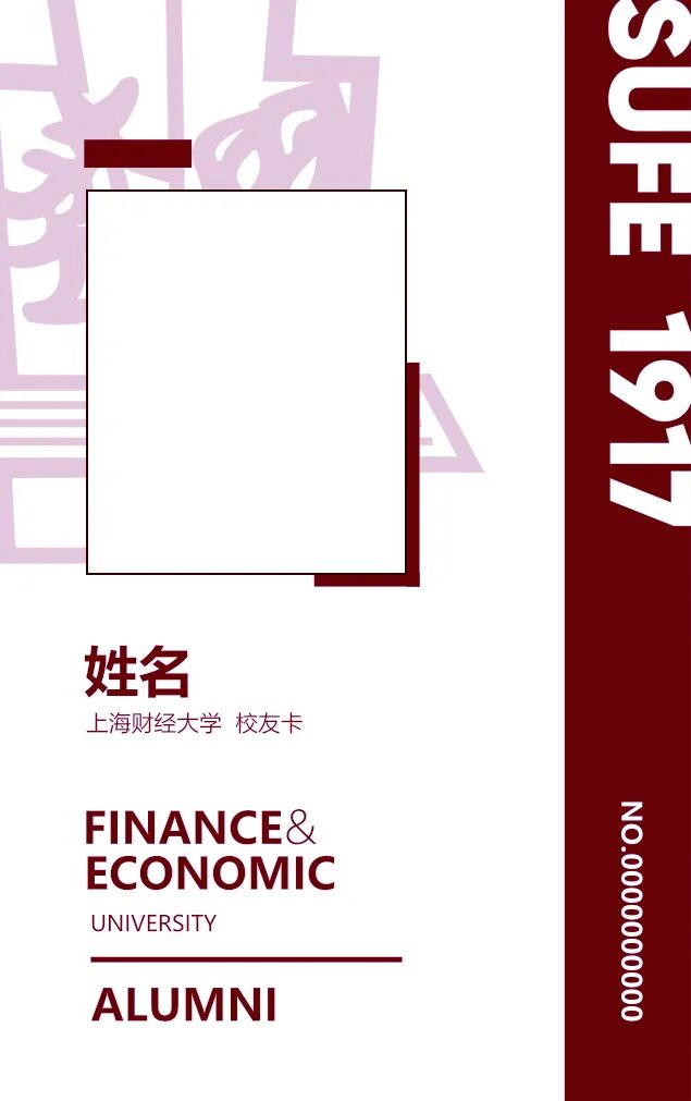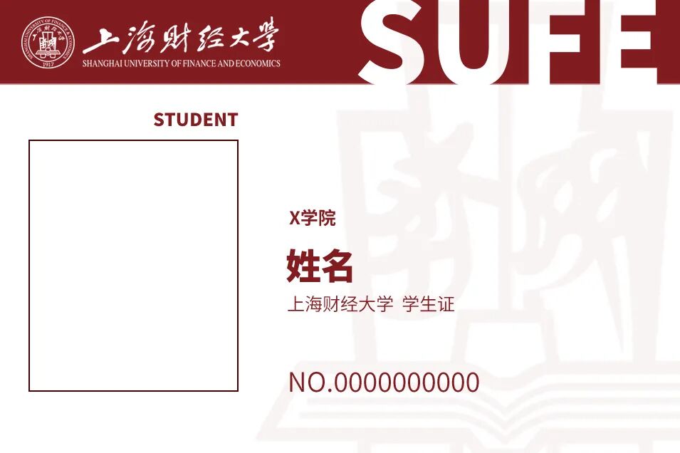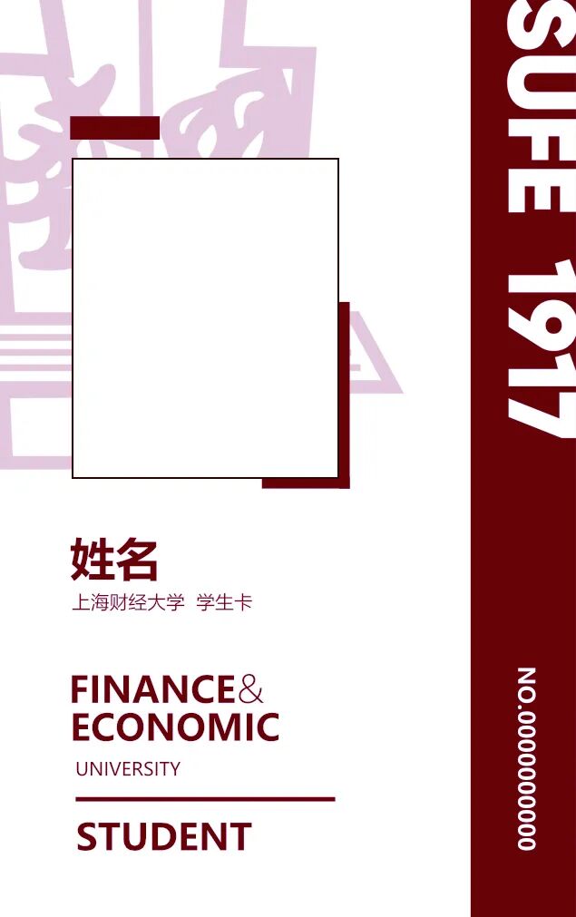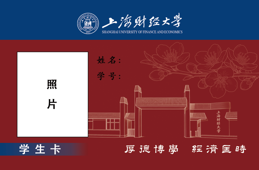 设计理念:本次校卡设计风格以简明大气为核心原则,使用上财红做单色设计,对比明显,视觉冲击力强烈,切合学校沉稳,博学,笃行的气质。正面采用学校标志性的校门作为单色风格化底图,点明校训,办学时间,强调上海财经大学百年历史风貌。背面取校徽中的书本与古币元素,强调学校财经属性。整体构图协调美观,采用可商用思源黑体,信息一目了然,避免知产纠纷,单色设计便于印刷,兼具美观性与实用性。